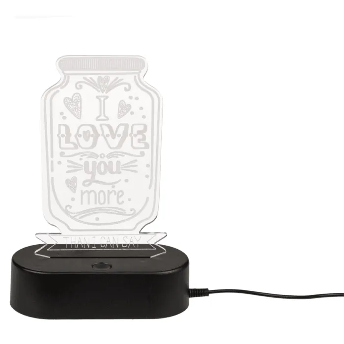 Die 3D-Leuchte “Love” ist ein wahrer Blickfang, der Ihrem Zuhause eine einzigartige Atmosphäre verleiht. Mit dem liebevollen Schriftzug „I love you more than I can say“ wird sie zu einem Symbol der Zuneigung und eignet sich perfekt, um Ihre Gefühle auf eine ganz besondere Weise auszudrücken. Ihr modernes Design und die leuchtende, dreidimensionale Schrift ziehen sofort die Blicke auf sich und schaffen eine warme, einladende Stimmung. Mit einer Größe von ca. 20 cm ist sie sowohl dezent als auch eindrucksvoll.