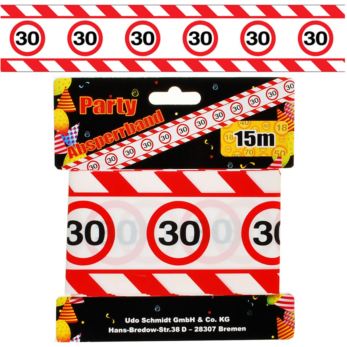 Mit den schwarzen Zahlen “30” in den Motiven von Verkehrsschildern mit roter Umrandung und dem rot/weiß Randstreifen, sieht das Absperrband sehr originell aus. Es passt perfekt in jede Geburtstagsdekoration. Als Schleife gebunden oder in einem Präsent drapiert, dient es dazu noch als edles Verpackungselement.