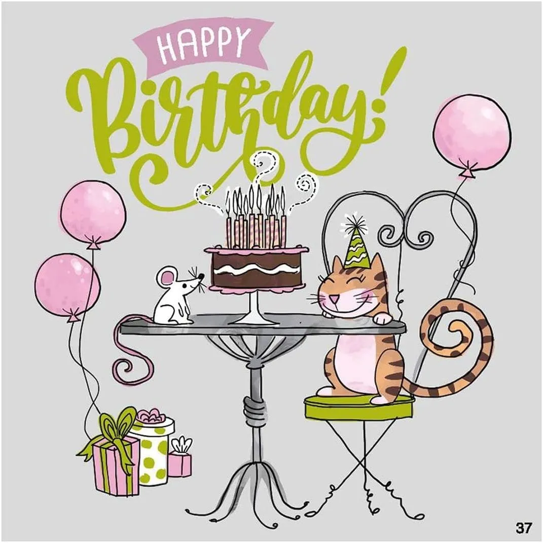 Das liebevoll gestaltete Design auf der Vorderseite zeigt eine Katze und eine Maus, die gemeinsam an einem festlich gedeckten Tisch mit Geburtstagstorte sitzen – ein symbolträchtiges Motiv für wahre Freundschaft. Darüber steht in großen Buchstaben: „HAPPY Birthday!“, was sofort ins Auge fällt und Freude ausstrahlt.