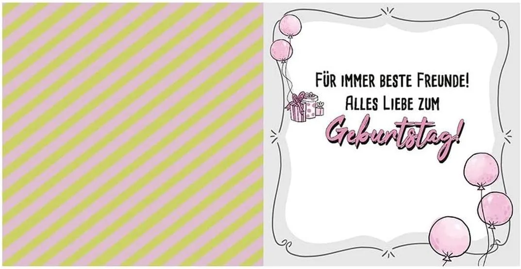 Im Inneren der Karte steht auf der rechten Seite ein herzlicher Geburtstagsgruß: „FÜR IMMER BESTE FREUNDE! ALLES LIEBE ZUM Geburtstag!“ Dieser Text ist stilvoll umrahmt und lässt viel Raum für Gefühle. Die linke Seite bleibt bewusst frei, damit Sie Ihre ganz persönlichen Worte und Glückwünsche hinzufügen können.