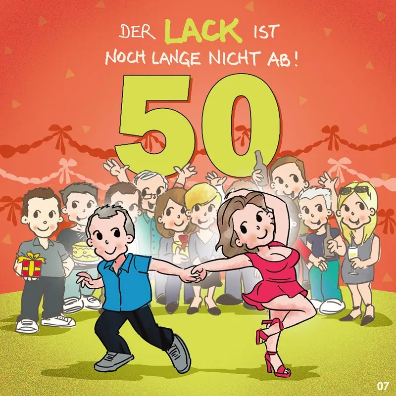 Schon das Design macht klar: Hier wird das Älterwerden gefeiert – und zwar mit Stil und Humor. Der rot-grüne Hintergrund zieht alle Blicke auf sich. Mittig prangt der verspielte Schriftzug „DER LACK IST NOCH LANGE NICHT AB!“, darunter eine große, kräftig-grüne „50“. Und als echter Hingucker tanzt darunter ein reiferes Paar mit Leidenschaft und Freude – eine liebevolle Erinnerung daran, dass man nie zu alt ist, um das Leben zu genießen.