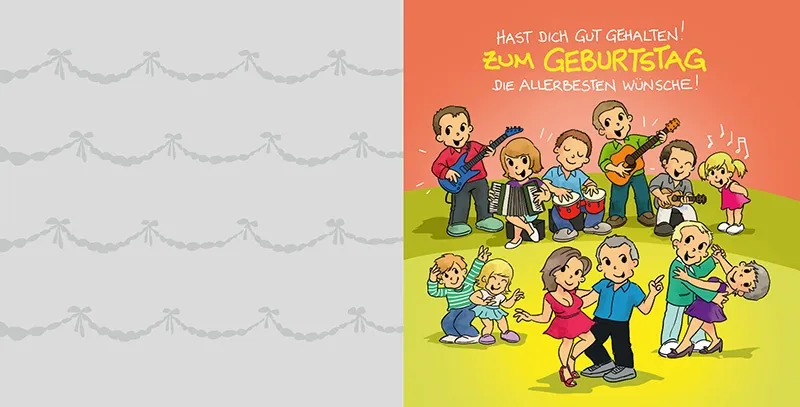 Im Inneren der Karte geht der Spaß weiter: Rechts steht auf fröhlich gestaltetem Hintergrund der Spruch „HAST DICH GUT GEHALTEN! ZUM GEBURTSTAG DIE ALLERBESTEN WÜNSCHE!“. Darunter feiert eine tanzende und musizierende Gesellschaft – bunt, fröhlich, lebendig. Die linke Seite der Karte ist bewusst freigehalten, damit Sie Ihre persönlichen Glückwünsche, liebevollen Worte oder lustige Anekdoten ergänzen können.