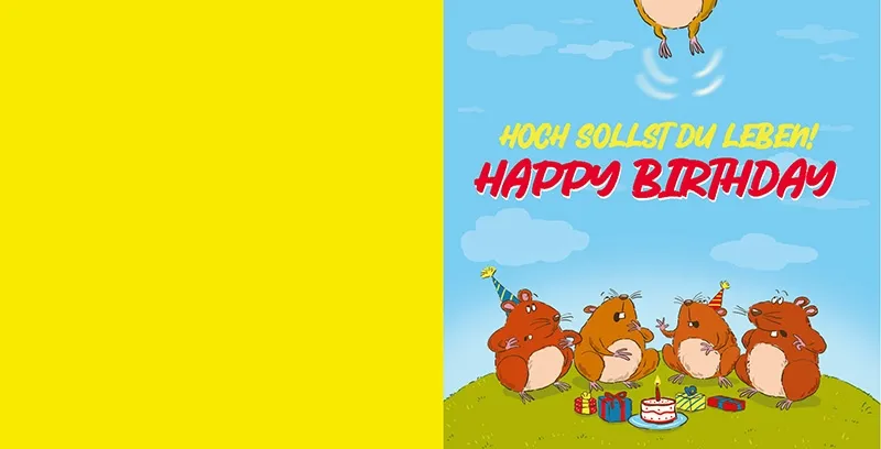 Beim Öffnen der Karte setzt sich die Szene fort – nur ist der schwebende Hamster jetzt ganz weit oben zu sehen, während die anderen Hamster erstaunt und besorgt nach oben blicken. Die liebevolle Botschaft im Inneren: „HOCH SOLLST DU LEBEN! HAPPY BIRTHDAY“ – sorgt für Überraschung und Schmunzeln zugleich. Die linke Innenseite bleibt frei für Ihre persönlichen Worte.