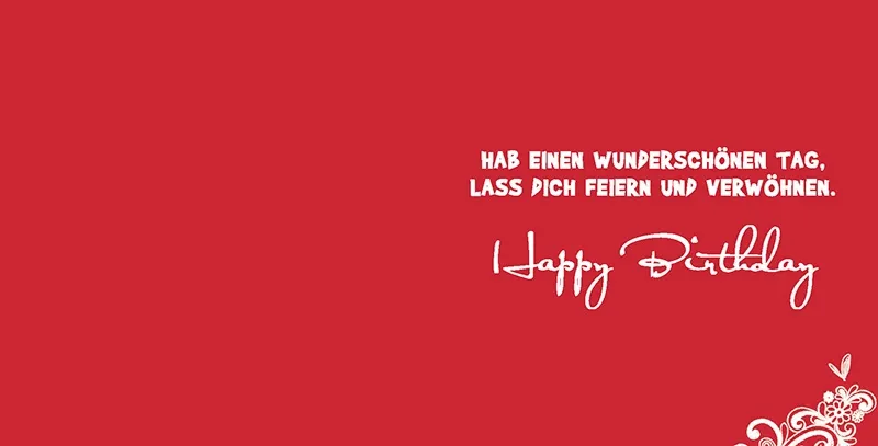 Im Inneren der Karte überrascht ein kräftiges Rot. Auf der rechten Seite steht in Weiß: „Hab einen wunderschönen Tag, lass dich feiern und verwöhnen. Happy Birthday.“ Die linke Seite ist frei für Ihre ganz persönlichen Worte. So können Sie die Karte individuell gestalten – ehrlich, herzlich und nahbar.