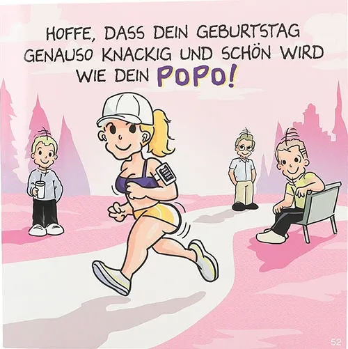 Das Design unterstreicht diesen Gute-Laune-Moment perfekt: Die Vorderseite zeigt eine Frau beim Joggen durch einen pinkfarbenen Park. Ihr sportliches Outfit bleibt nicht unbemerkt – drei Männer drehen sich begeistert nach ihr um. Darüber prangt mit einem Augenzwinkern der Spruch: „Hoffe, dass dein Geburtstag genauso knackig und schön wird wie dein Popo!“ Frech? Ja. Geschmacklos? Ganz sicher nicht. Diese Karte ist charmant, humorvoll – und ganz nebenbei ein echtes Kompliment.