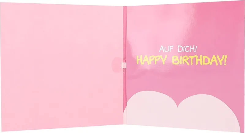 Im Inneren der Musikkarte „Dein Geburtstag” geht es heiter weiter: Ein stilisierter Po ziert die rechte Seite, darüber steht schlicht und herzlich: „Auf dich! Happy Birthday!“ Die linke Seite bleibt frei für Ihre persönlichen Glückwünsche – ehrlich, witzig oder liebevoll, ganz wie Sie es möchten.