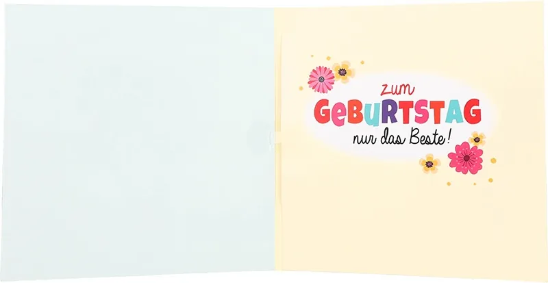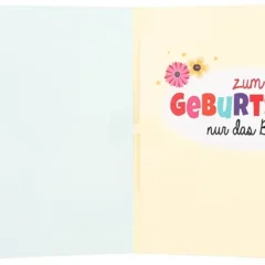 Innen setzt sich die heitere Stimmung fort. Auf der rechten Seite steht in bunten Buchstaben der Wunsch: „Zum GEBURTSTAG nur das Beste!“, umgeben von kleinen Blumenillustrationen, die das Motiv perfekt abrunden. Die linke Seite ist bewusst freigehalten – hier ist Platz für Ihre ganz persönlichen Worte, liebe Grüße oder eine kleine Anekdote.