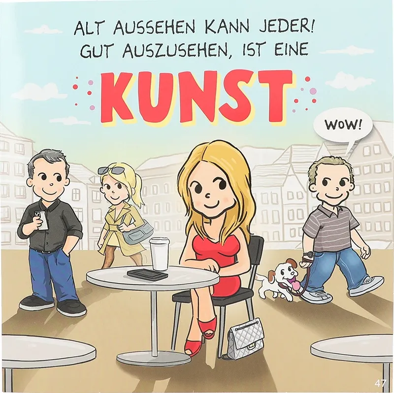 Auch optisch überzeugt die Karte auf ganzer Linie. Die Vorderseite zeigt eine stilvolle Stadtszene: Eine elegante Frau sitzt selbstbewusst im Café, während Passanten fasziniert stehen bleiben. Einer sagt anerkennend „WOW!“ – und genau das trifft den Ton. Darüber lesen Sie den frechen, aber charmanten Schriftzug: „Alt aussehen kann jeder! Gut auszusehen, ist eine Kunst.“ Diese Aussage bringt nicht nur ein Schmunzeln, sondern unterstreicht auch das Besondere des Geburtstagskindes.
