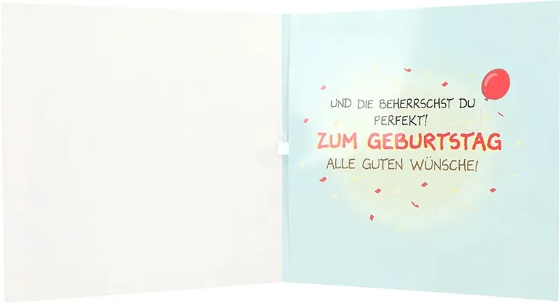 Im Inneren geht es mit einem liebevollen Kompliment weiter: „Und die beherrschst du perfekt! Zum Geburtstag alle guten Wünsche!“ Konfetti und ein Luftballon ergänzen das Design und schaffen eine fröhliche Atmosphäre. Auf der linken Seite bleibt ausreichend Platz für Ihre persönlichen Zeilen – denn ein ehrlicher Glückwunsch bleibt immer unvergesslich.