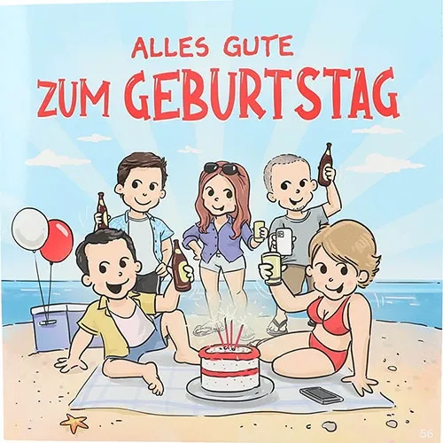Die Vorderseite der Karte zeigt eine fröhliche Gruppe, die am Strand feiert – mit Getränken in der Hand und einer Geburtstagstorte auf der Decke. Die Sonne strahlt, der Himmel ist klar, und die Stimmung ist einfach perfekt. Darüber steht in großen Buchstaben: „ALLES GUTE ZUM GEBURTSTAG“ – schlicht, aber voller Herz.