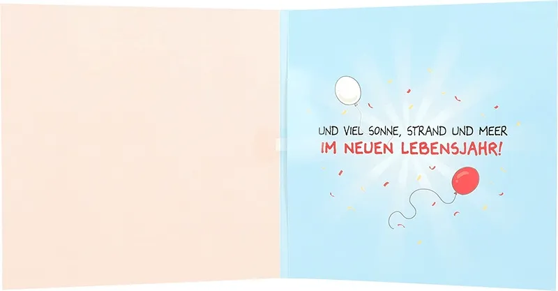 Im Inneren geht die sonnige Botschaft weiter: „UND VIEL SONNE, STRAND UND MEER IM NEUEN LEBENSJAHR!“ Dazu sind Luftballons, Konfetti und bunte Farben liebevoll arrangiert. Die linke Innenseite bietet Ihnen viel Platz für Ihre eigenen Glückwünsche – egal ob persönlich, witzig oder klassisch.
