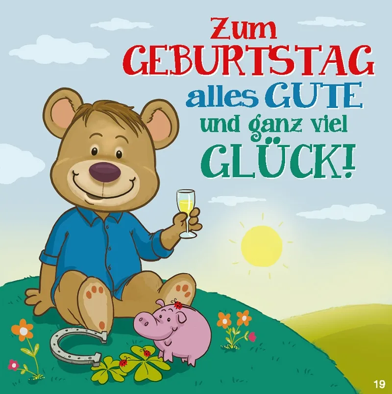 Das fröhliche Design auf der Vorderseite zeigt eine sonnige Landschaft, in deren Mitte ein niedlicher Teddybär mit Getränk in der Hand für gute Laune sorgt. Um ihn herum tummeln sich kleine Glücksbringer wie ein Sparschwein, ein Marienkäfer, Kleeblätter und Hufeisen. Darüber strahlt der farbenfrohe Schriftzug: „Zum GEBURTSTAG alles GUTE und ganz viel GLÜCK!“
