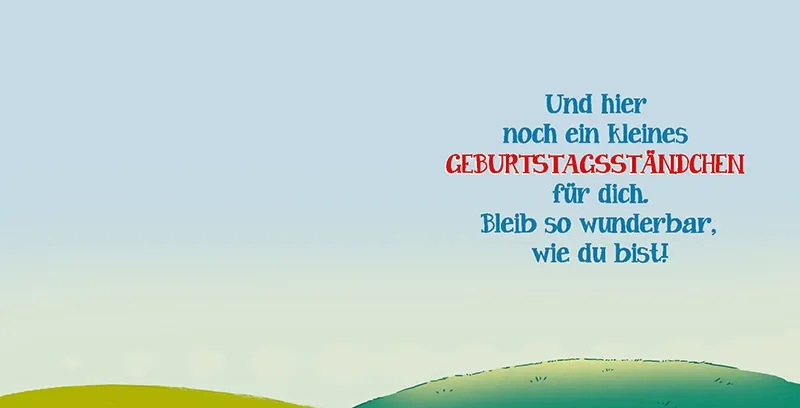 Im Inneren der Karte erwartet das Geburtstagskind ein liebevoller Gruß: „Und hier noch ein kleines GEBURTSTAGSSTÄNDCHEN für dich. Bleib so wunderbar, wie du bist!“ Die linke Seite ist bewusst freigehalten – hier haben Sie Platz für Ihre ganz persönlichen Worte, Wünsche und Gedanken.