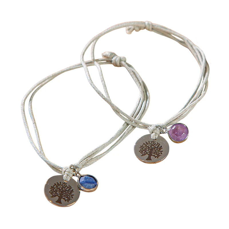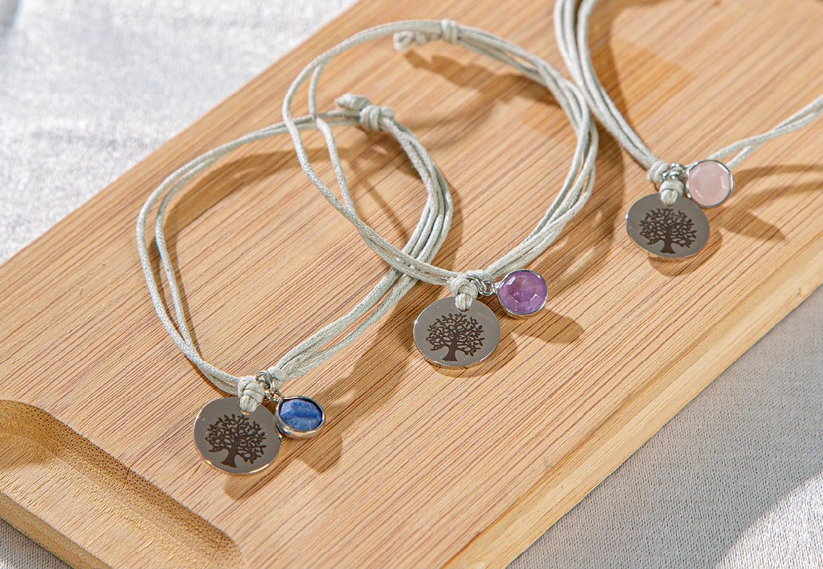 Gefertigt aus einer feinen, grauen Textilkordel, schmiegt sich das Armband angenehm um Ihr Handgelenk. Zudem lässt sich die Weite individuell einstellen (ca. 25 cm Umfang), sodass es sowohl zart als auch flexibel ist. Es ist leicht, dezent und dennoch ein Blickfang – ideal für den Alltag, aber auch als eleganter Akzent zu besonderen Anlässen. Zwei runde Anhänger verleihen diesem Schmuckstück seine besondere Wirkung. Zum einen ein zartes, rundes Metallplättchen mit dem detailreich aufgedruckten Lebensbaum, zum anderen ein edler, fein polierter Schmuckstein, sicher eingefasst in eine glänzende Metallfassung.