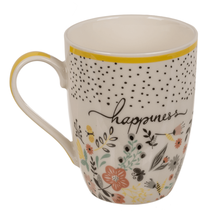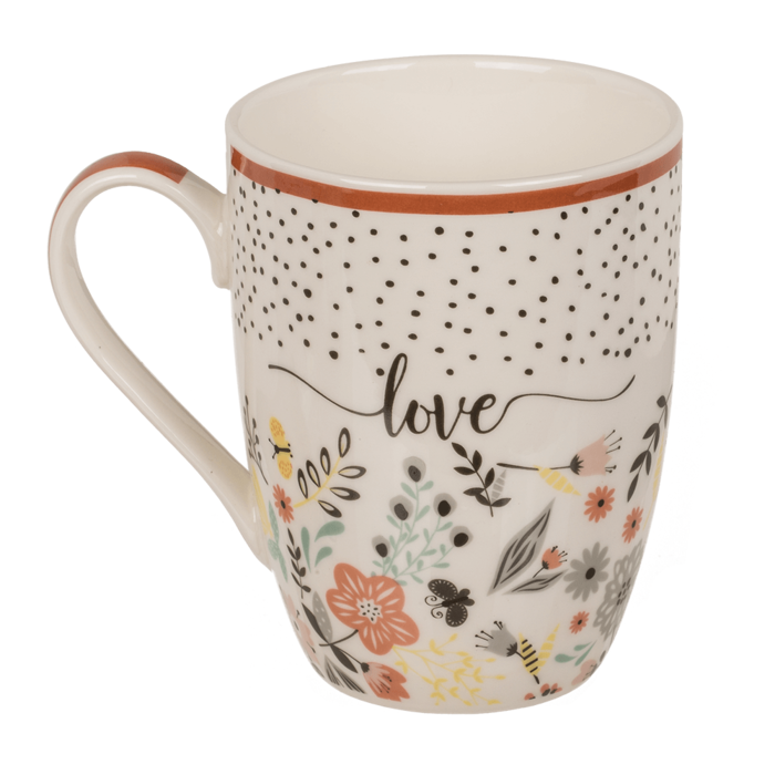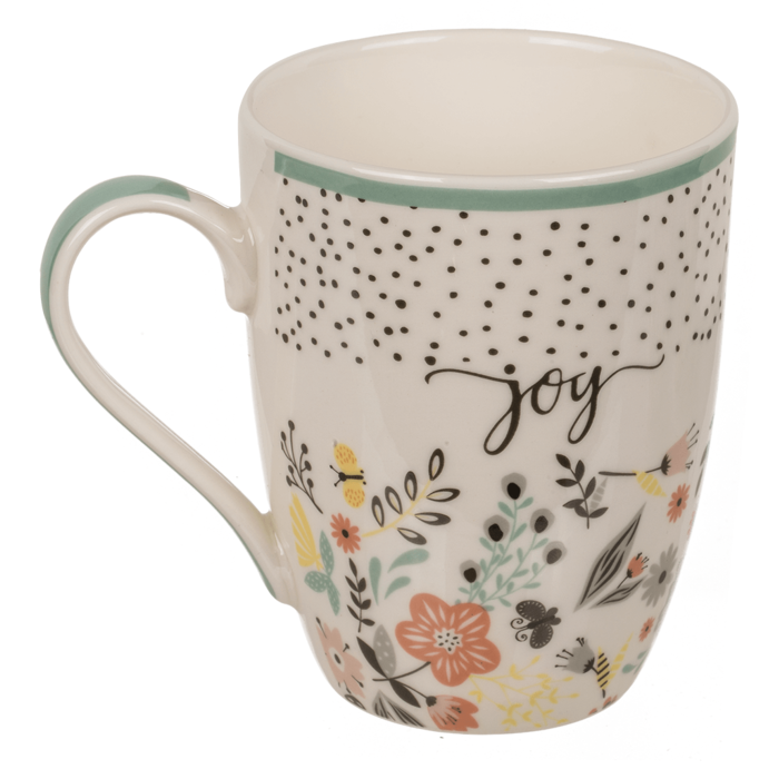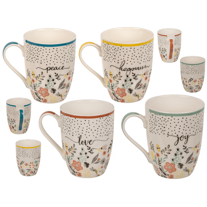 Doch das wahre Highlight des Bechers ist sein florales Design, das garantiert frischen Wind auf Ihre Kaffeetafel bringt. Die untere Hälfte des Bechers ist von einer Vielzahl bunter Blüten und zarter Blätter verziert. Diese floralen Details lassen den Becher wie ein Stück Natur wirken und wecken Erinnerungen an den Frühling. Die obere Hälfte hingegen ist mit einem feinen Punktmuster geschmückt, das dem Becher einen eleganten Touch verleiht. Zwischen den Blüten und Blättern finden sich zudem wunderschöne geschwungene Schriftzüge wie “joy”, “peace”, “happiness” und “love”. Diese Worte voller positiver Energie verleihen dem Becher eine ganz besondere Note.
