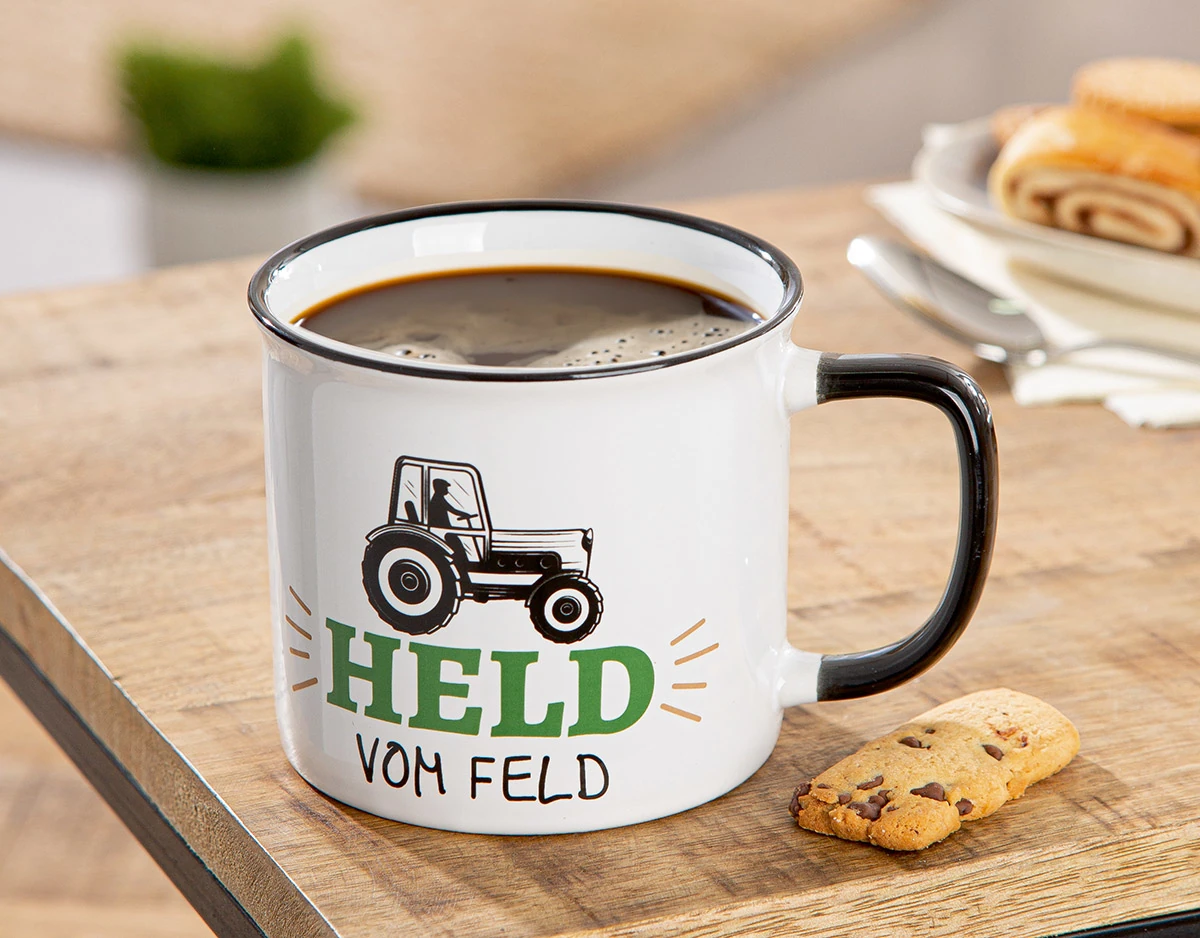 Mit einem Fassungsvermögen von ca. 390 ml bietet der Becher „Landleben“ mit Traktormotiv viel Platz für Kaffee, Tee oder jedes andere Lieblingsgetränk. Darüber hinaus eignet er sich wunderbar als kreative Geschenkidee: Befüllen Sie ihn mit Teebeuteln, Schokolade oder anderen kleinen Aufmerksamkeiten – und im Handumdrehen entsteht ein persönliches Präsent mit Herz und Humor.