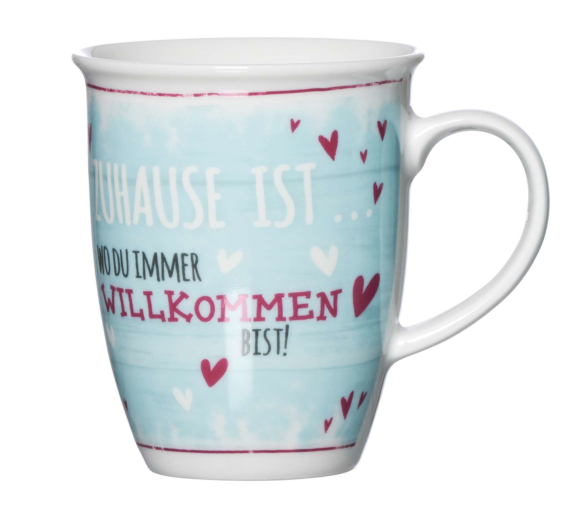 Dann ist diese coole Tasse in hellblau genau die Richtige. Mit ihrem schönen Spruch “Zuhause ist … wo du immer willkommen bist” und den vielen, kleinen Herzen ein Hingucker und schönes Geschenk zu jedem Anlass.
