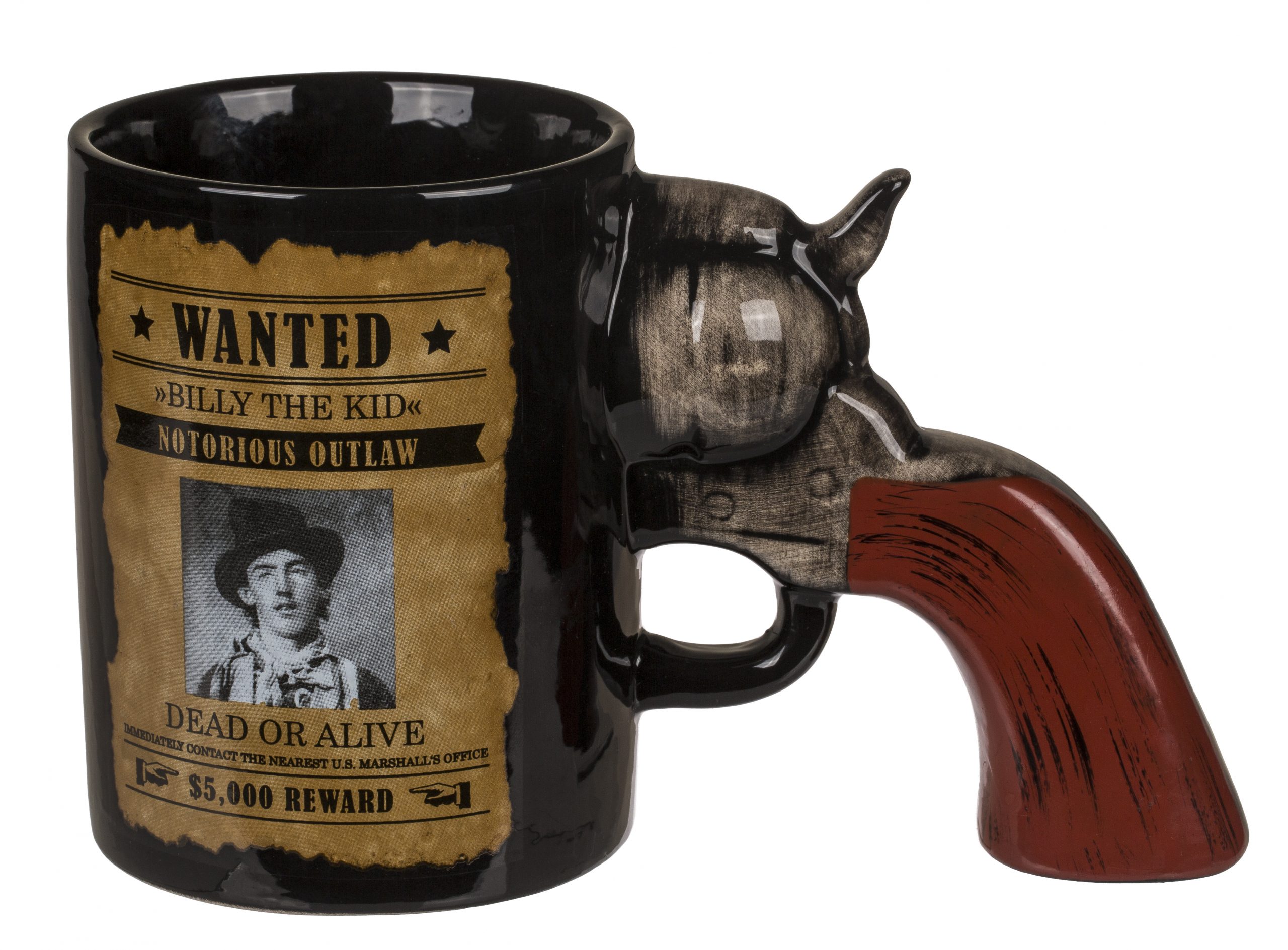 Wanted dead or alive – Kopfgeld: 5000 Dollar. Ein cooler Becher mit Revolvergriff aus Steingut und dem Steckbrief von Billy The Kid, dem legendären Banditen des Wilden Westens.