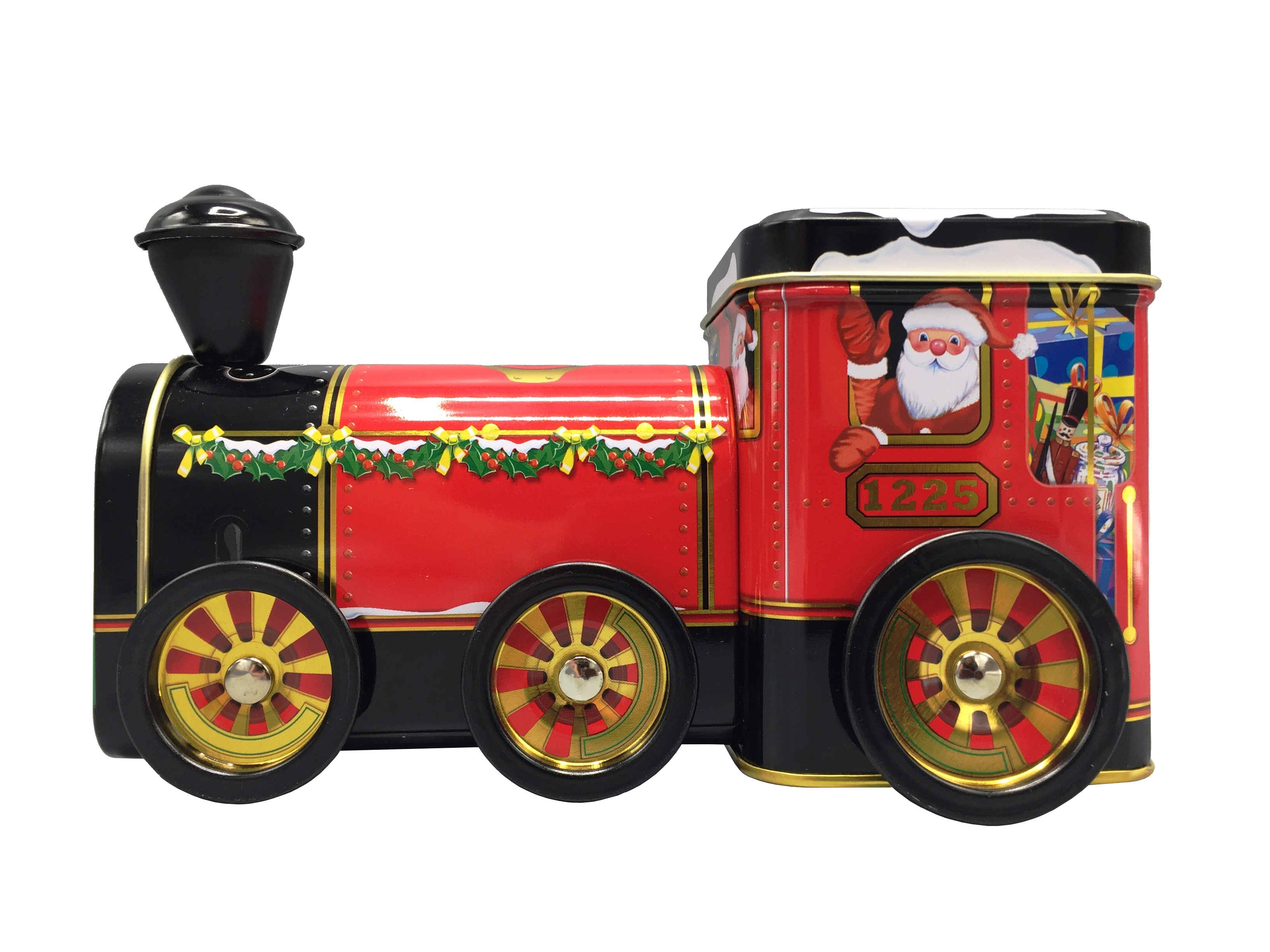 Eine tolle nostalgisch angehauchte Keks- oder Gebäckdose in Form und Gestaltung einer Lokomotive. Perfekt um kleine Leckereien toll in Szene zu setzen. Die tolle rote Lokomotive ist mit vielen kleinen Details gestaltet. So ist das Führerhaus und der vordere Teil der Lokomotive mit einem Deckel versehen, um viele kleine schöne Sachen zu verstauen. EinWeihnachtsmann winkt aus dem Führerhaus. Die Räder dieser Lokomotive sind beweglich und machen sie somit komplett.