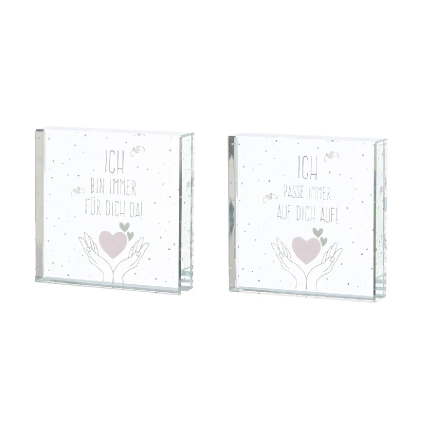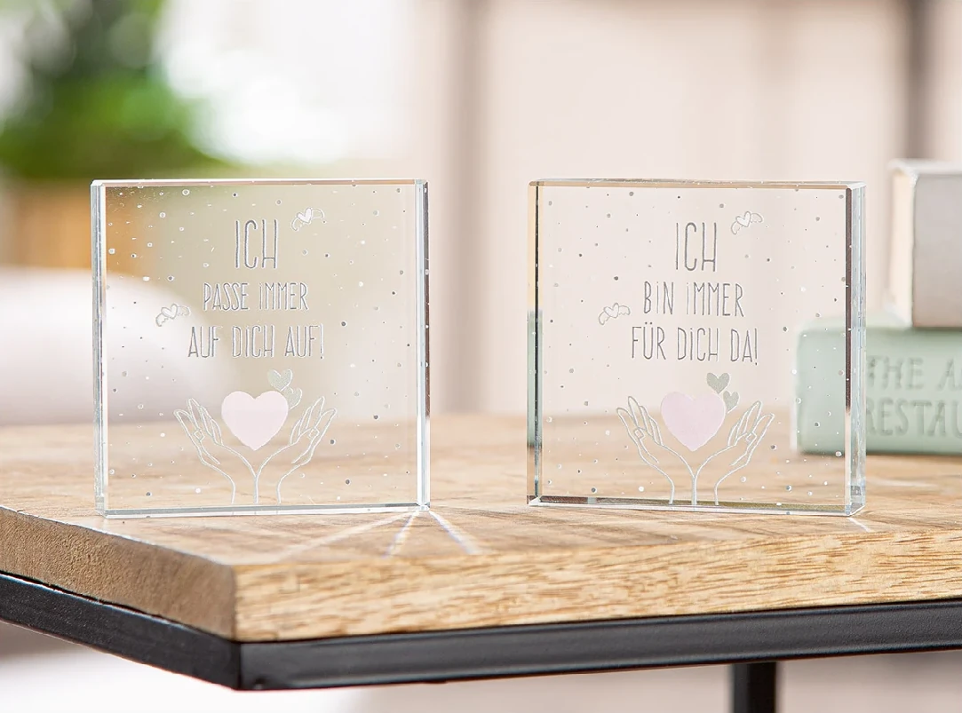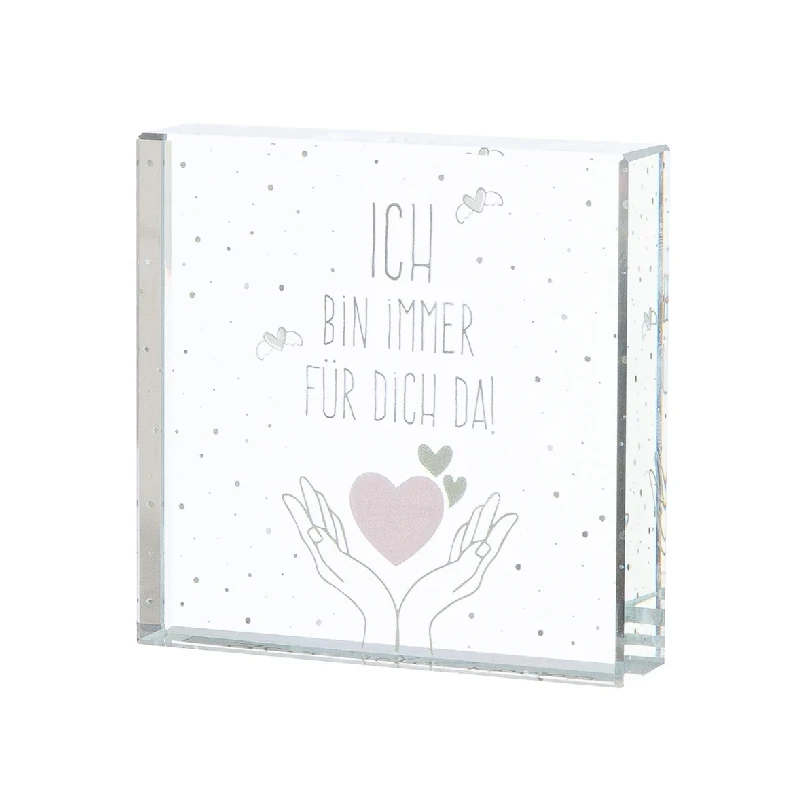 Erhältlich ist der Briefbeschwerer „Herzchen“ in zwei liebevoll gestalteten Varianten: Die erste trägt den Satz „Ich bin immer für dich da!“, der Nähe, Unterstützung und Verlässlichkeit ausdrückt. Die zweite Variante sagt „Ich passe immer auf dich auf!“ – eine Botschaft, die Trost spendet und Geborgenheit vermittelt. In beiden Designs sind stilisierte Hände zu sehen, die ein Herz behutsam halten. Diese Darstellung verstärkt den emotionalen Wert und macht die symbolische Bedeutung sofort greifbar.
