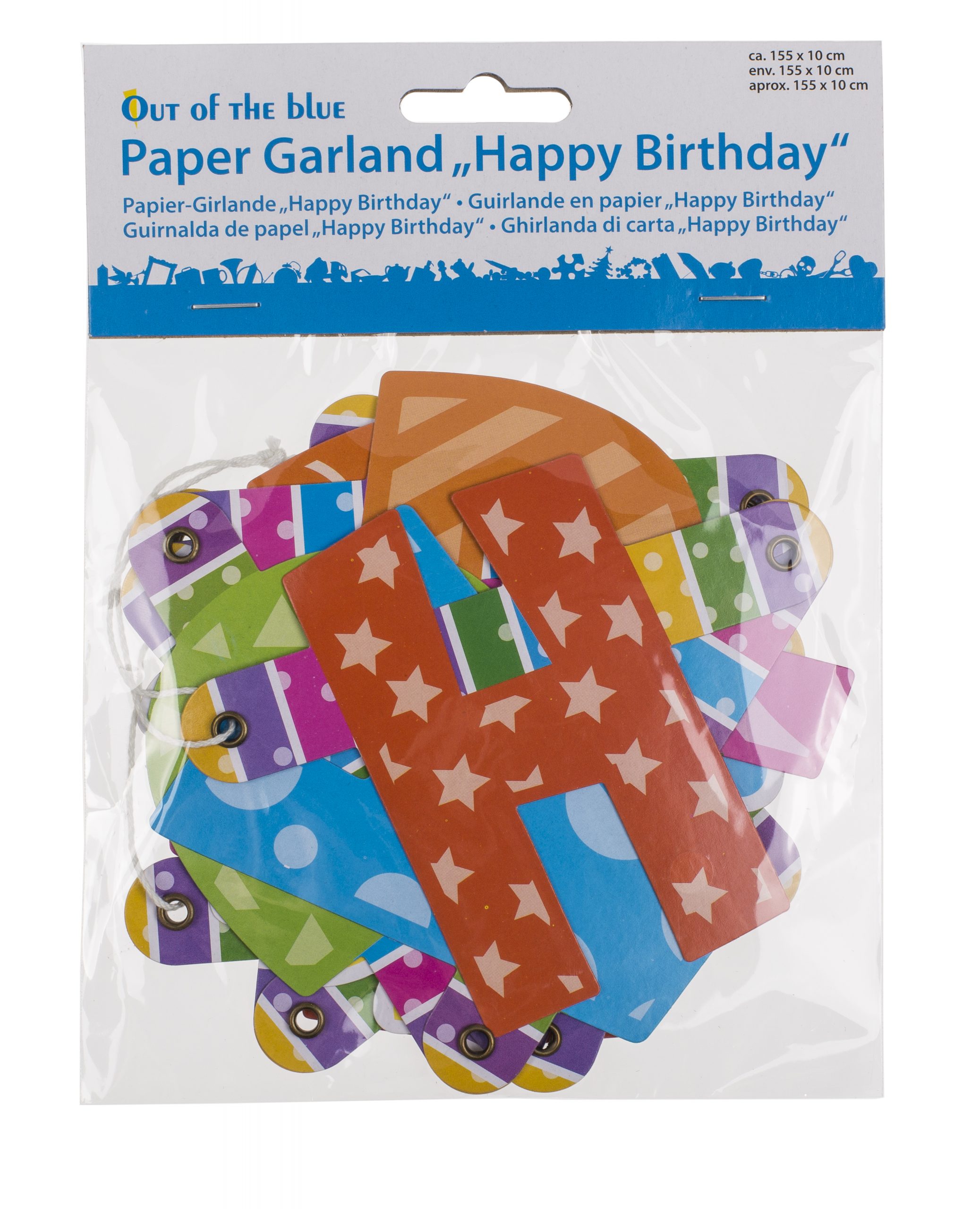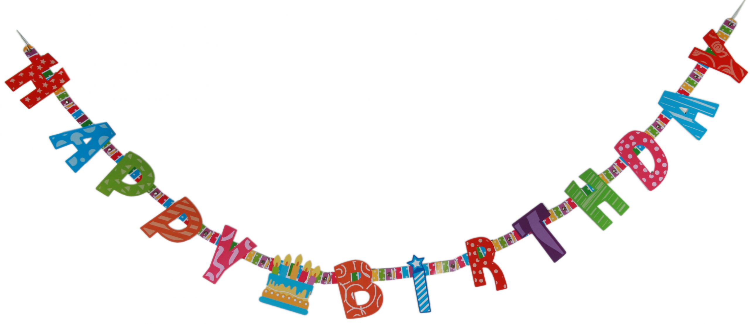 Da die Girlande aus Papier besteht ist sie insbesondere für den Innenbereich geeignet. Zwischen den beiden Wörtern ist das Motiv von einer Torte mit Kerzen.