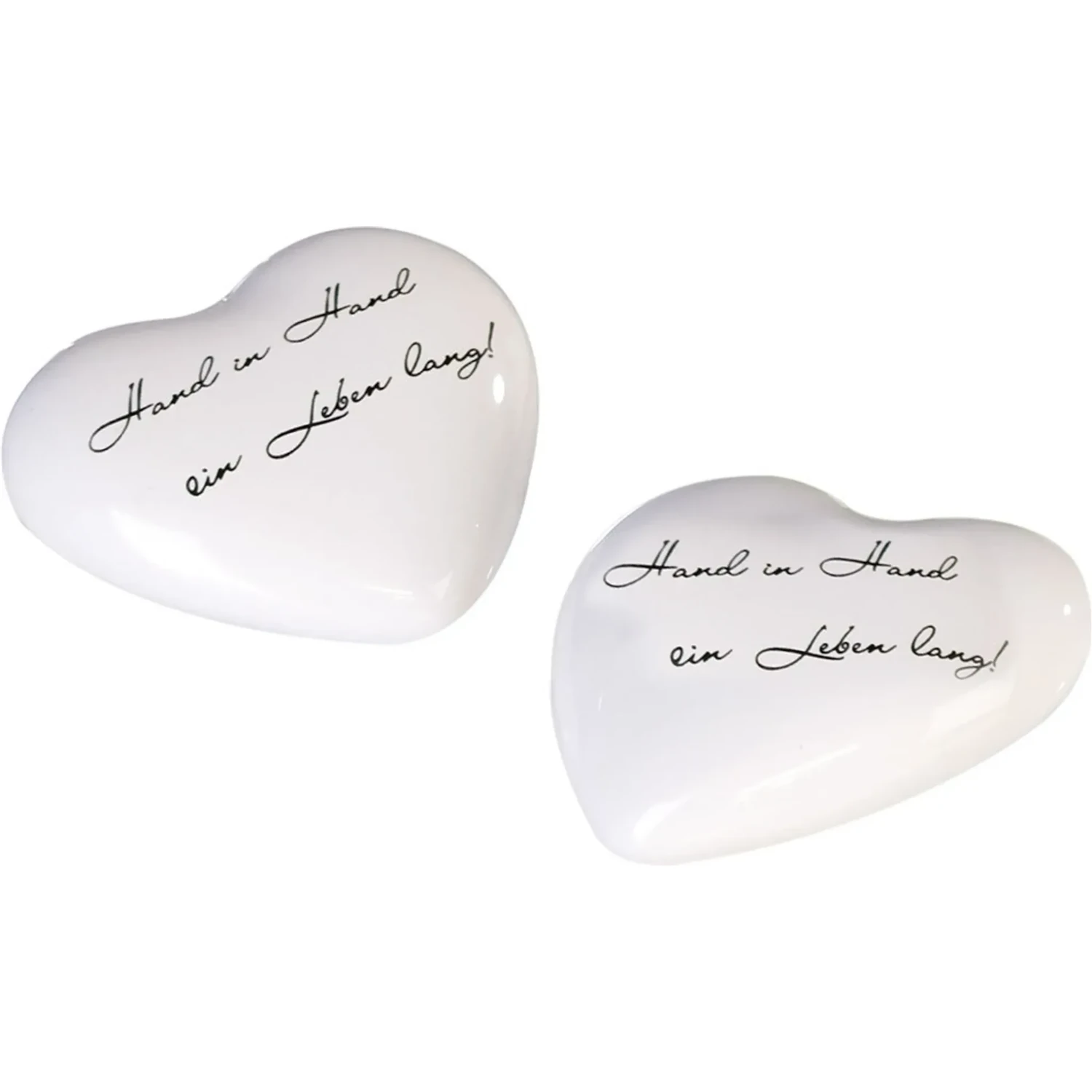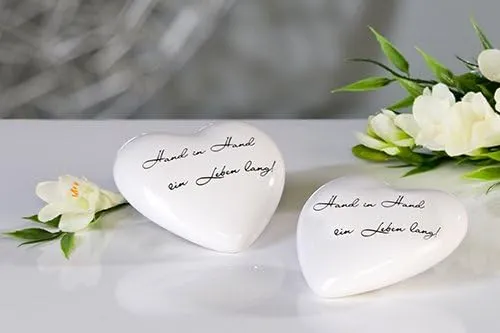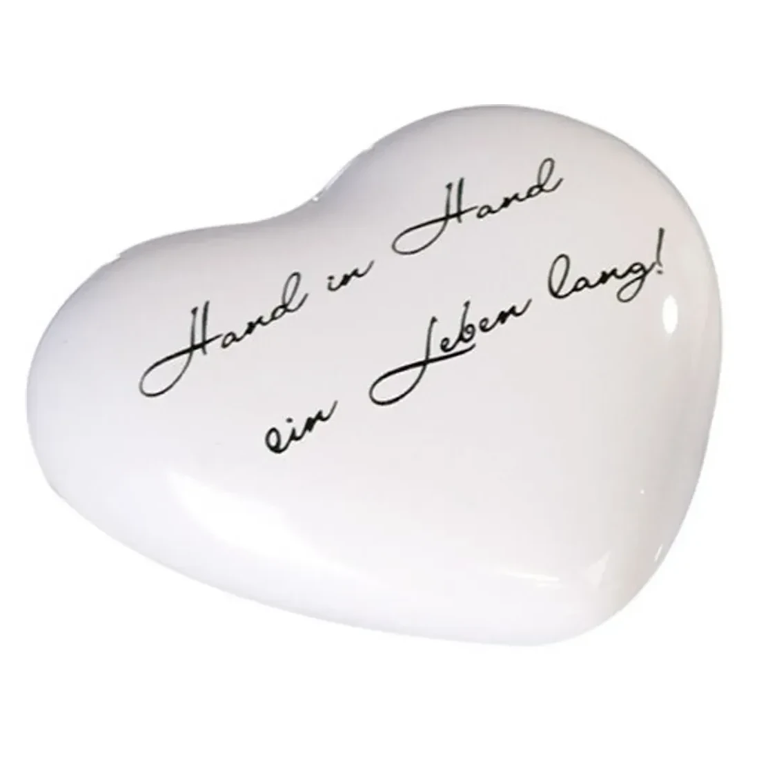 Gefertigt aus hochwertiger, glänzend weiß glasierter Keramik, wirkt dieses Herz zeitlos schön und gleichzeitig modern. Der elegante, silberne Schriftzug „Hand in Hand ein Leben lang!“ ist nicht nur eine romantische Botschaft, sondern ein echtes Statement. Er erinnert daran, was wirklich zählt – jeden Tag aufs Neue.