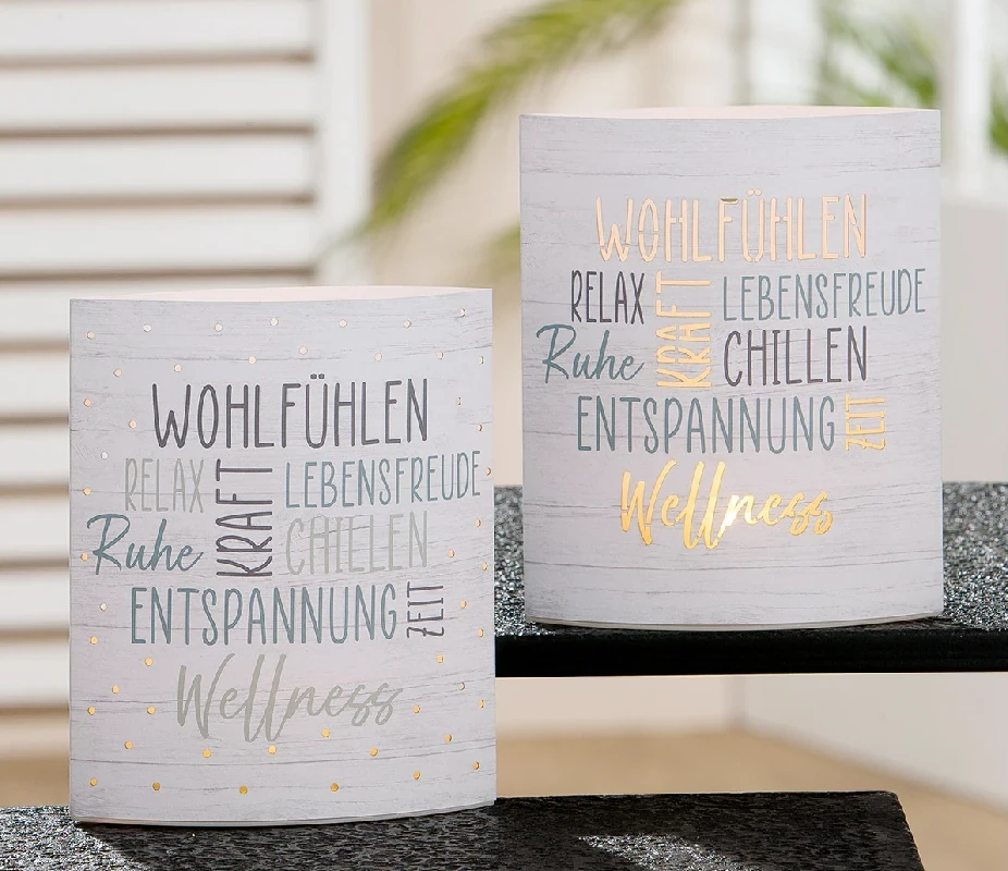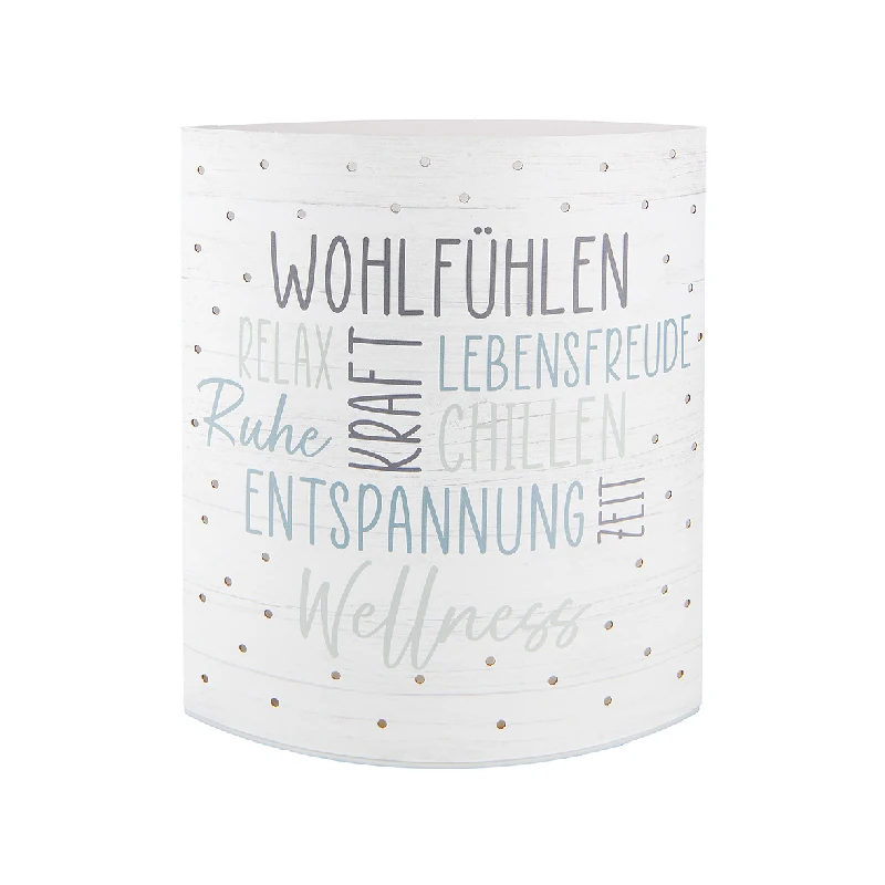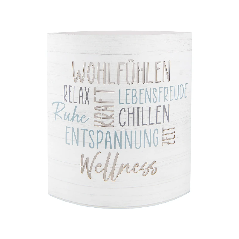 Inmitten der Hektik des Alltags erinnern uns kleine Dinge daran, innezuhalten. Die Dekoleuchte “Wellness” ist genau solch ein liebevoll gestaltetes Detail. Sie schenkt nicht nur sanftes, warmes Licht, sondern trägt eine wohltuende Botschaft in sich: „Wohlfühlen – Relax – Ruhe – Kraft – Lebensfreude – Chillen – Entspannung – Zeit – Wellness“. Worte, die wirken – leise, tief und beruhigend.