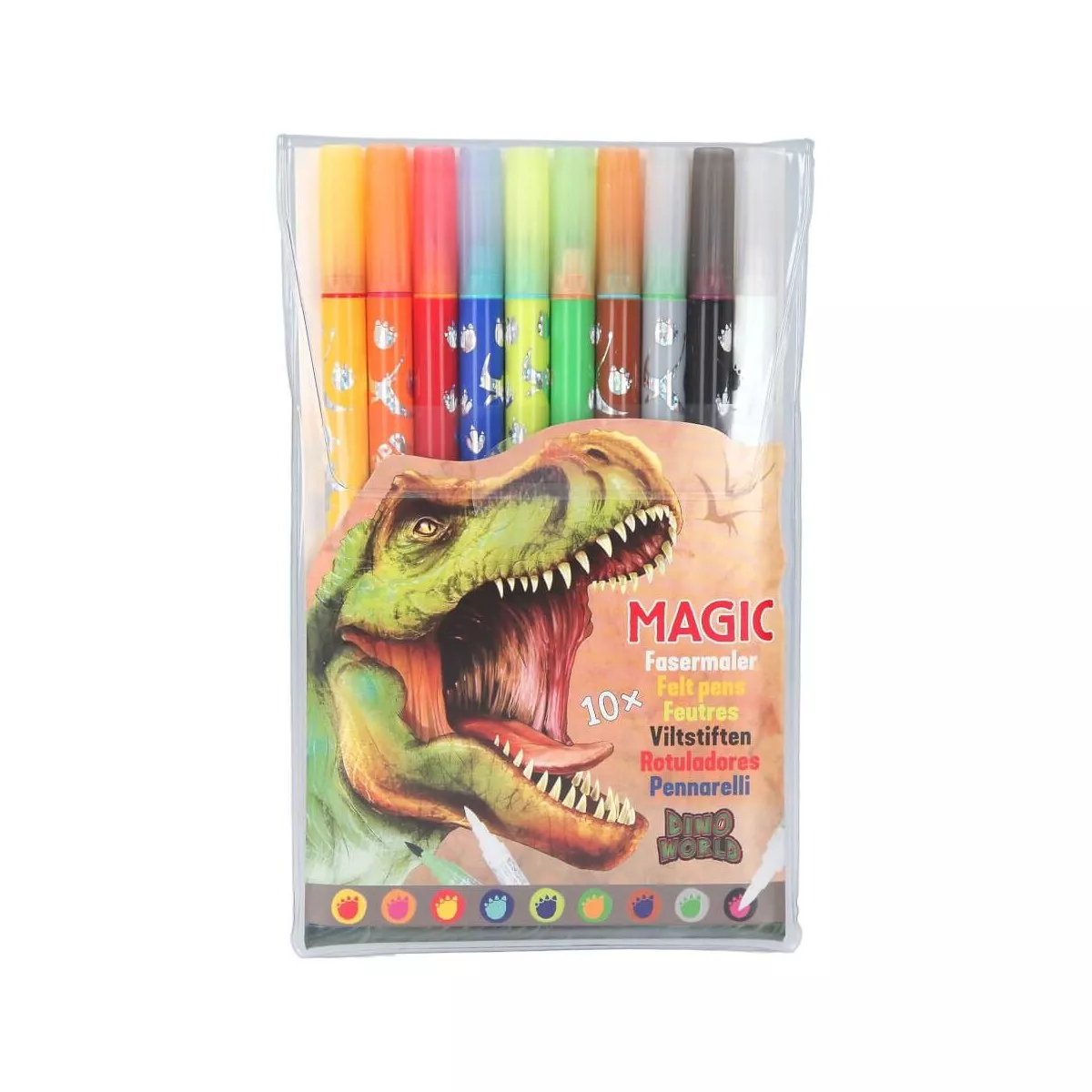 Entdecken Sie die zauberhafte Welt des Malens mit Dino World! Mit diesem einzigartigen Set erhalten Sie 9 lebendige Magic-Doppelfasermaler und einen magischen Stift, zum Drübermalen. Tauchen Sie ein in die Magie der Tinte und erleben Sie, wie aus 9 brillanten Stiftfarben unglaubliche 18 Farben werden. Jeder Doppelfasermaler verfügt über eine Pinselspitze (0,5–2 mm) auf einer Seite und eine dünne Spitze (0,5 mm) auf der anderen Seite, um Ihnen maximale Vielseitigkeit beim Malen zu bieten. Das Set ist in einem coolen Dino-Look gestaltet und wird in einem transparenten Täschchen geliefert, damit Sie Ihre magischen Künstlerwerkzeuge immer griffbereit haben. Lassen Sie Ihrer Kreativität freien Lauf und erschaffen Sie fantastische Kunstwerke mit dem Magisch Malen mit Dino World Set!