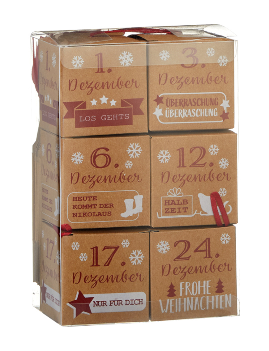 Langweilige Adventskalender mit immer gleicher Schokolade gehören der Vergangenheit an! Mit dem DIY-Adventskalender “Box” haben Sie die Möglichkeit, Ihren Liebsten die Vorfreude auf Weihnachten individuell und mit persönlicher Note zu gestalten. Dieses Set bietet alles, was Sie brauchen, um einen einzigartigen Adventskalender zu kreieren.