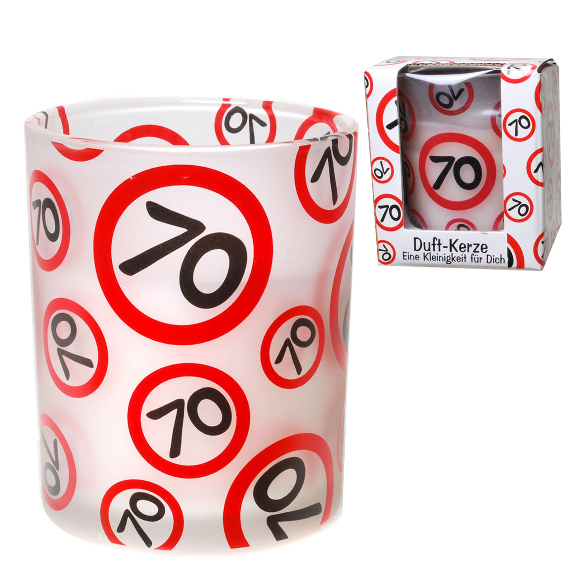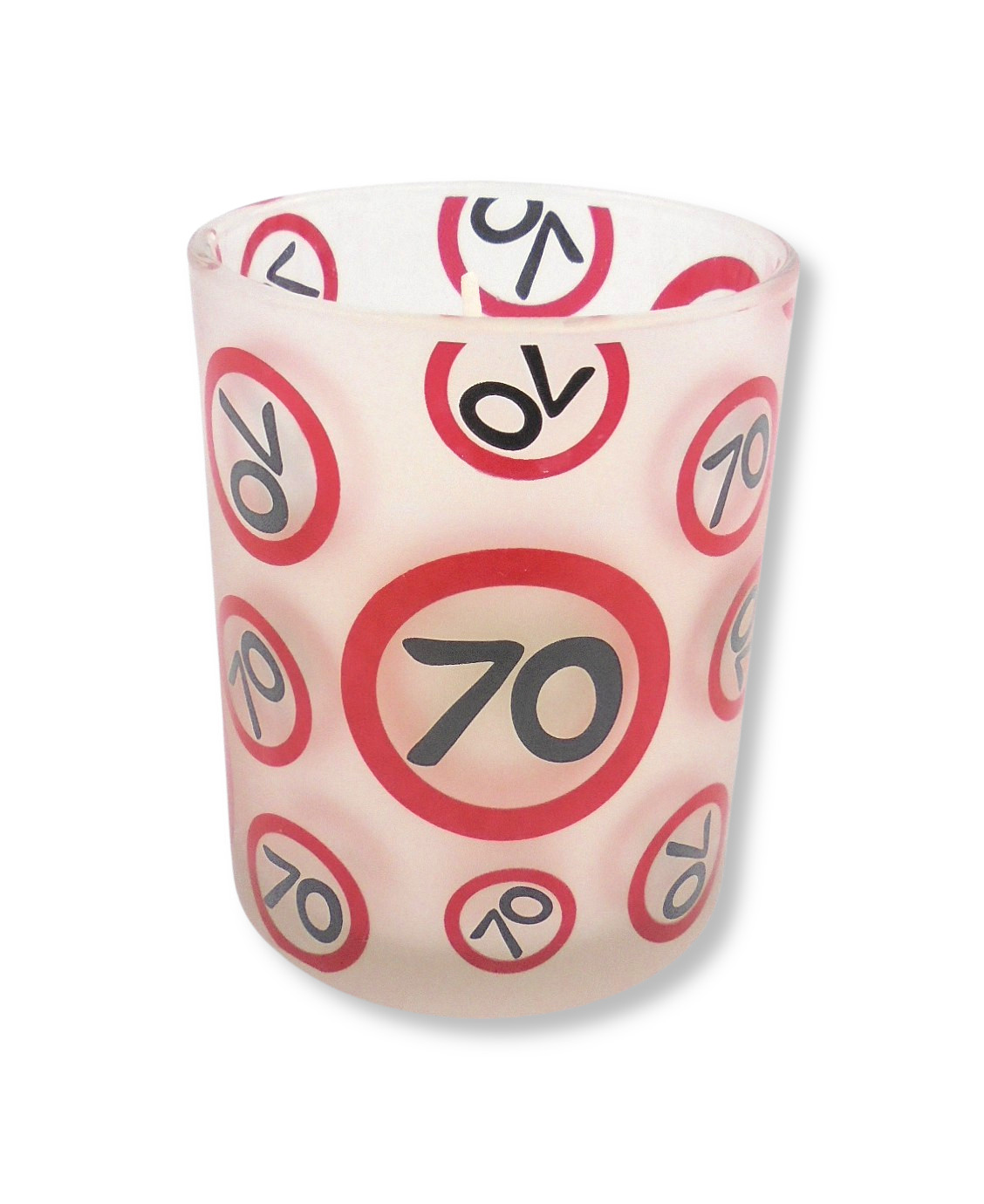 Auf dem Windlichtglas ist mehrfach die 70 in einem nachempfundenen Verkehrsschild abgebildet. Daher bietet sich diese Kerze an als Blickfang in einer Dekoration auf dem Geburtstag oder einem Jubiläum zu dienen. Aber auch als Einzelgeschenk, Mitbringsel oder als Element in einem Präsent ist diese Kerze perfekt.