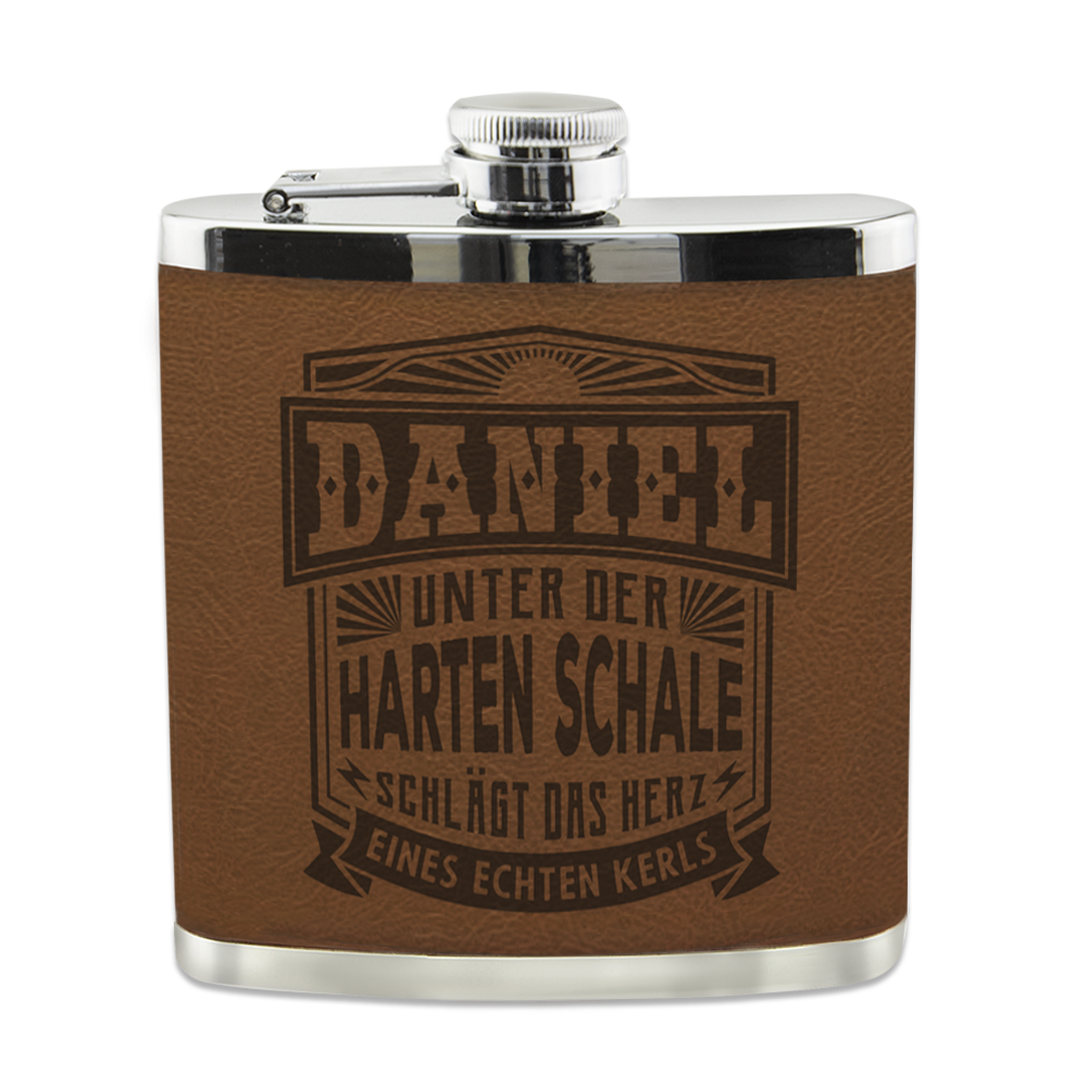 Der Echter-Kerl-Flachmann in der klassischen Nierenform ist aus Hart-Kunststoff und von außen mit Kunstleder verkleidet, in welche ein humorvoller Spruch eingeprägt ist. Das Design bricht damit aus dem typischen Flachmann-Klischee aus und wirkt erfrischend.