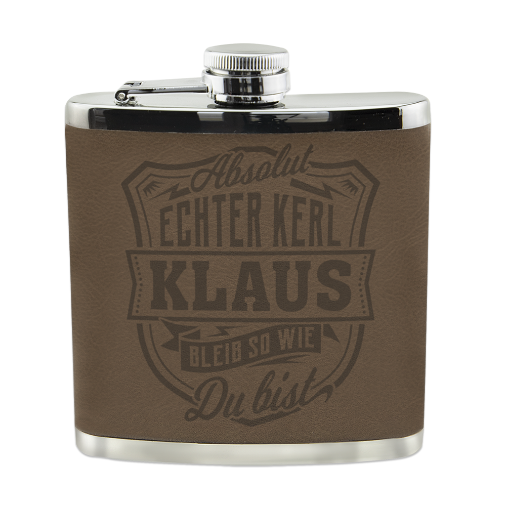 Der Echter-Kerl-Flachmann in der klassischen Nierenform ist aus Hart-Kunststoff und von außen mit Kunstleder verkleidet, in welche ein humorvoller Spruch eingeprägt ist. Das Design bricht damit aus dem typischen Flachmann-Klischee aus und wirkt erfrischend.