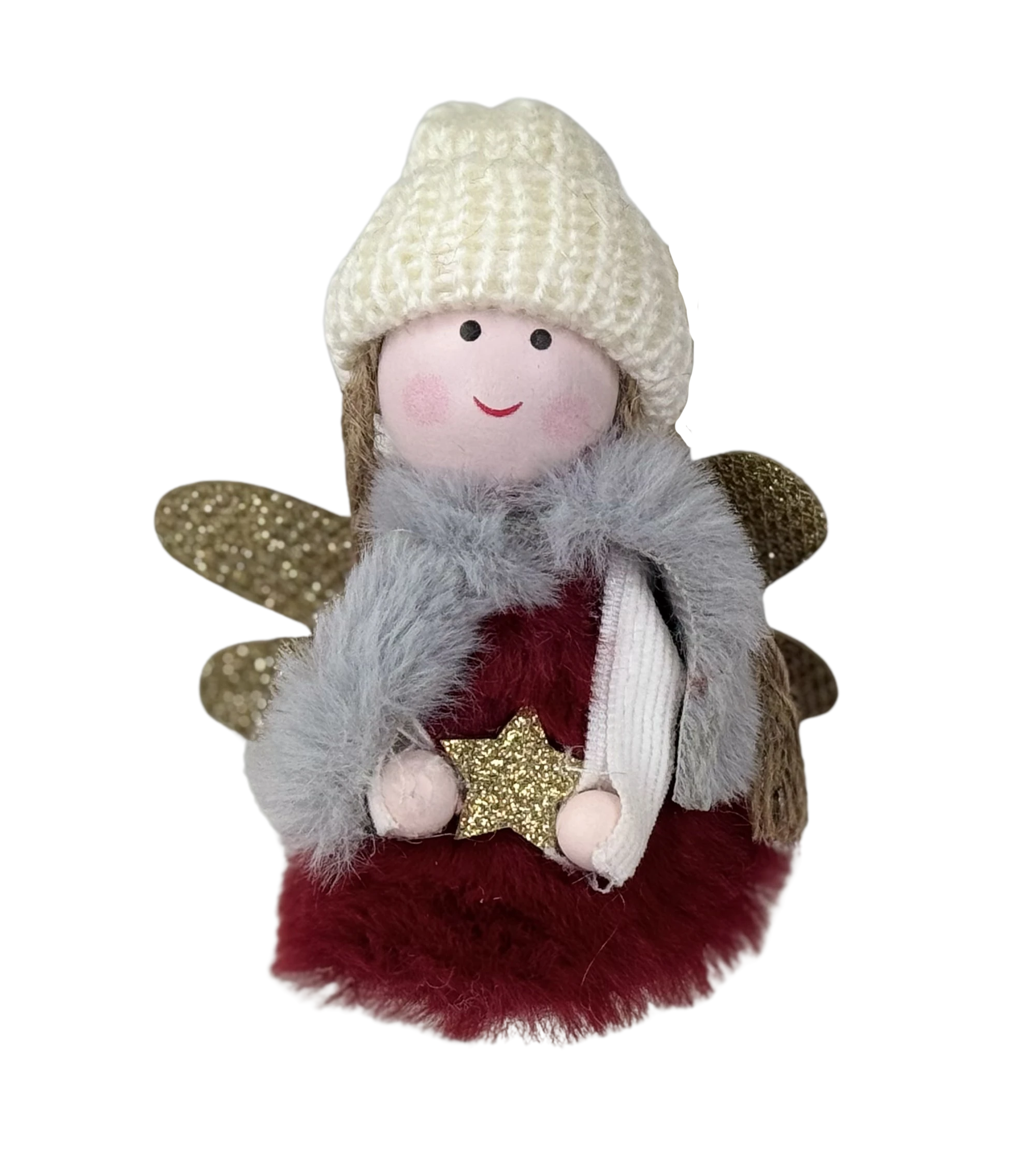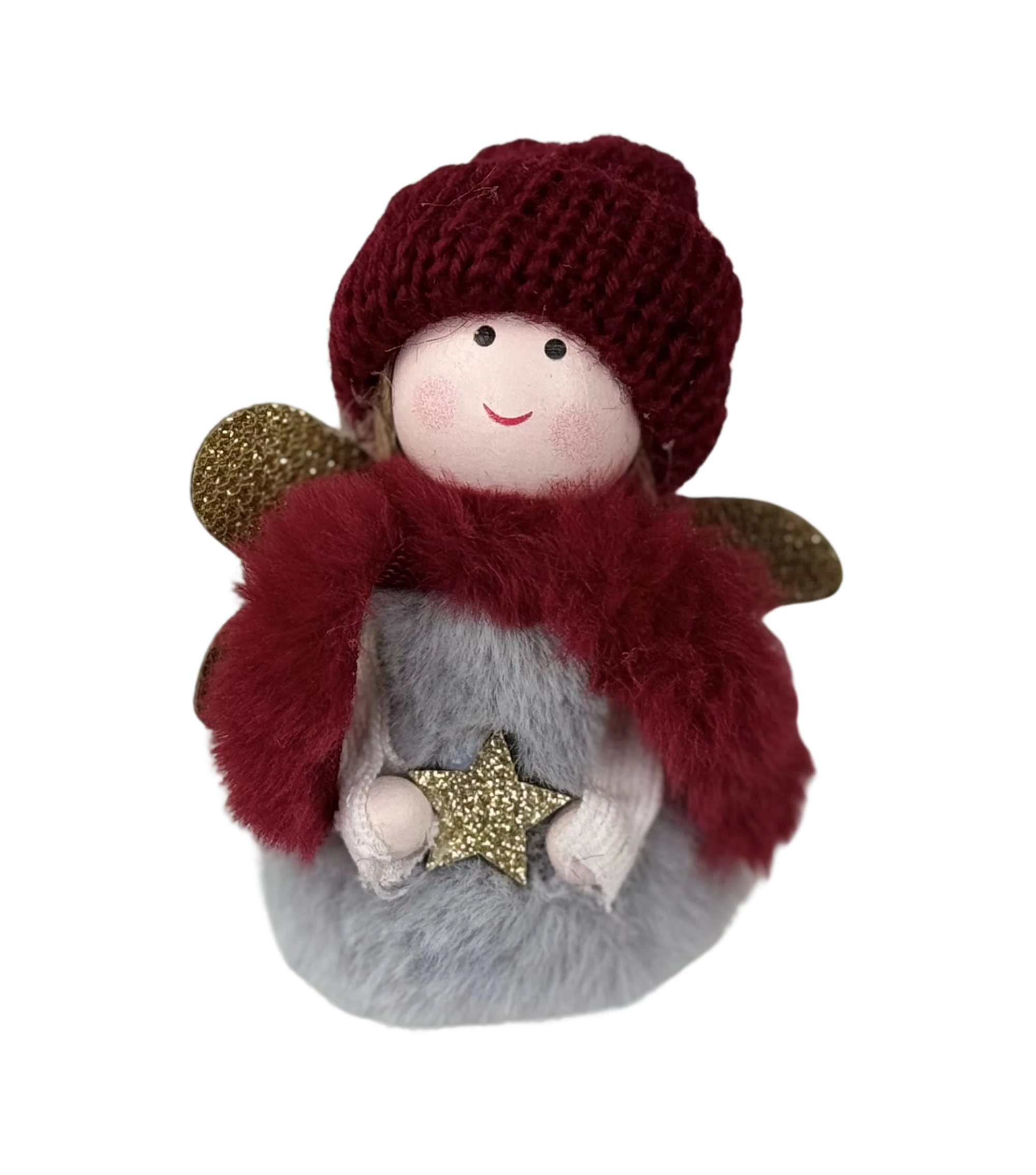 Die Deko-Figur zeichnet sich durch hochwertige Verarbeitung und viel Liebe zum Detail aus. Der Plüschmantel fühlt sich nicht nur besonders weich an, sondern unterstreicht auch die winterliche Gemütlichkeit, die von der Figur ausgeht. Die Strickmütze und der Schal verleihen dem Engel eine charmante, handgearbeitete Optik. Die kleinen, goldenen Flügelchen und der funkelnde Stern fügen der Figur eine edle Note hinzu und sorgen für ein festliches Glanzstück in Ihrer Winterdekoration.
