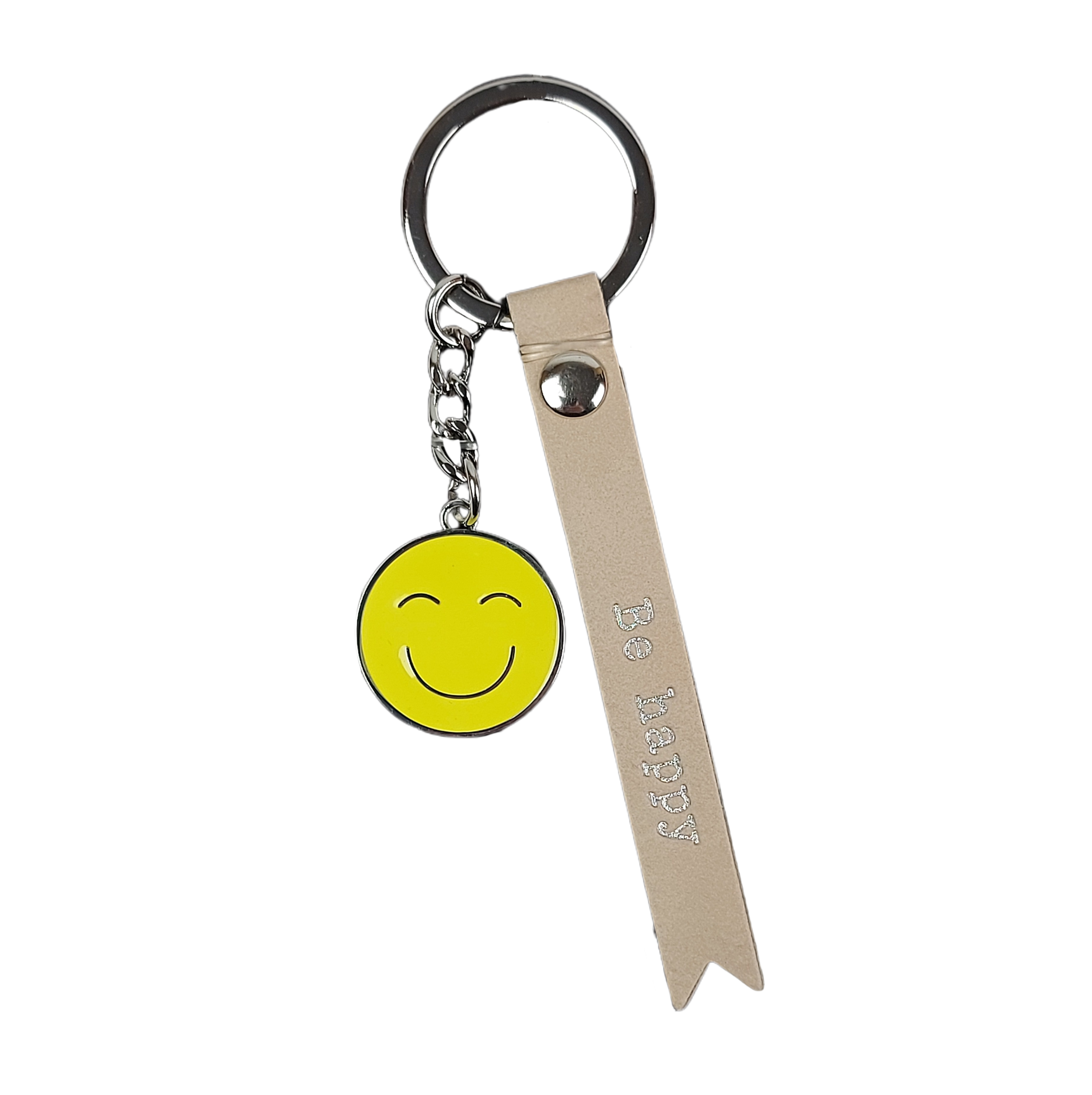 Bestehend aus zwei Anhängern, begeistert dieses charmante Accessoire mit durchdachtem Design und hochwertiger Verarbeitung. Der fröhliche Smiley aus silberfarbenem, emailliertem Metall strahlt in einem sonnigen Gelb – und schenkt dem Betrachter sofort gute Laune. Das beige Fähnchen aus edlem Kunstleder trägt in silberner Schrift die Botschaft „Be happy“ – eine einfache, aber so wichtige Erinnerung im Alltag. Beide Elemente sind sicher und stilvoll an einem stabilen Schlüsselring befestigt, der sich mühelos an Ihrem Schlüsselbund anbringen lässt.