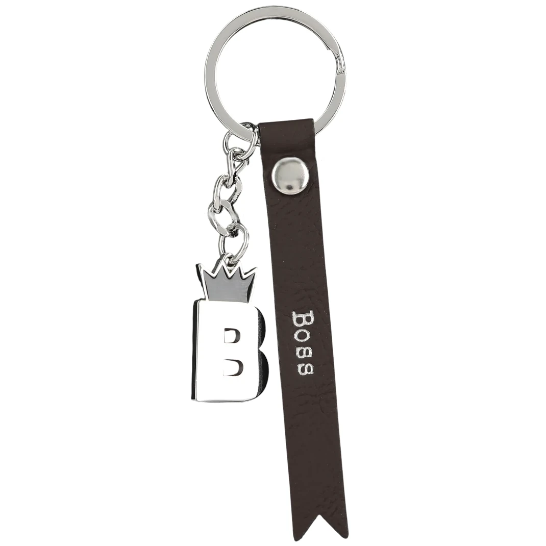 Der Schlüsselanhänger besteht aus zwei liebevoll gestalteten Anhängern. Zum einen ziert ein glänzender Buchstabe „B“ aus silberfarbenem emailliertem Metall den Ring. Ein kleines, schwarz emailliertes Krönchen setzt einen königlichen Akzent und macht deutlich, wer das Sagen hat. Zum anderen ergänzt ein hochwertiges Fähnchen aus dunkelbraunem Kunstleder das Design. In eleganter silberner Schrift steht darauf das Wort „Boss“ – stilvoll, selbstbewusst und mit einem Augenzwinkern. Eine glänzende Niete hält das Fähnchen sicher am stabilen Schlüsselring.