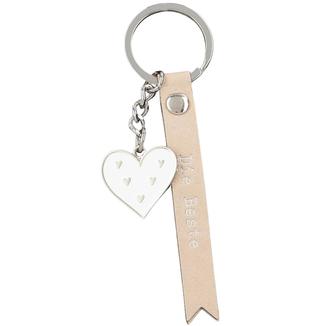 Der Schlüsselanhänger vereint zwei wunderschöne Elemente. Zum einen ziert ein silberfarbenes Herz aus emailliertem Metall den Ring. Kleine, glänzende Herzchen auf weißem Untergrund machen es zu einem echten Blickfang. Zum anderen rundet ein beiges Fähnchen aus hochwertigem Kunstleder das Design ab. Darauf steht in schimmernder Silberprägung: „Die Beste“ – schlicht, aber voller Bedeutung.