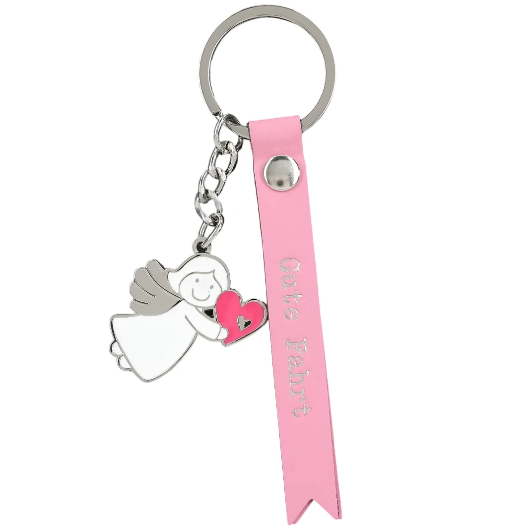 Zum anderen ergänzt ein Fähnchen aus hochwertigem Kunstleder in hellem Pink den Schlüsselanhänger. In eleganter Silberprägung steht darauf die liebevolle Botschaft: „Gute Fahrt“ – einfach, direkt und von Herzen. Eine silberne Niete hält das Fähnchen sicher am Ring und verleiht dem Ganzen eine moderne Note.