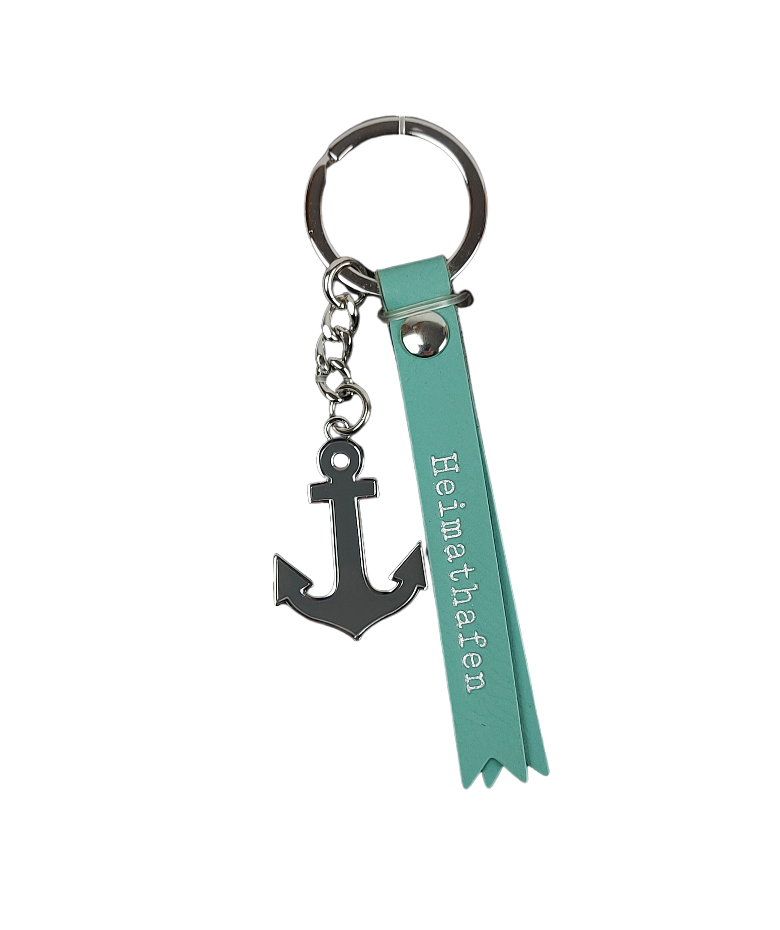 Dieses charmante Accessoire besteht aus zwei Anhängern, die zusammen eine besondere Geschichte erzählen. Zum einen ziert ein silberner Anker aus emailliertem Metall mit edler grauer Emaille den Anhänger. Zum anderen hängt daran ein hochwertiges Kunstlederfähnchen in frischem Türkis. Darauf steht in silberner Schrift das Wort „Heimathafen“ – eine wunderbare Erinnerung an die Menschen und Orte, die Ihr Herz berühren.