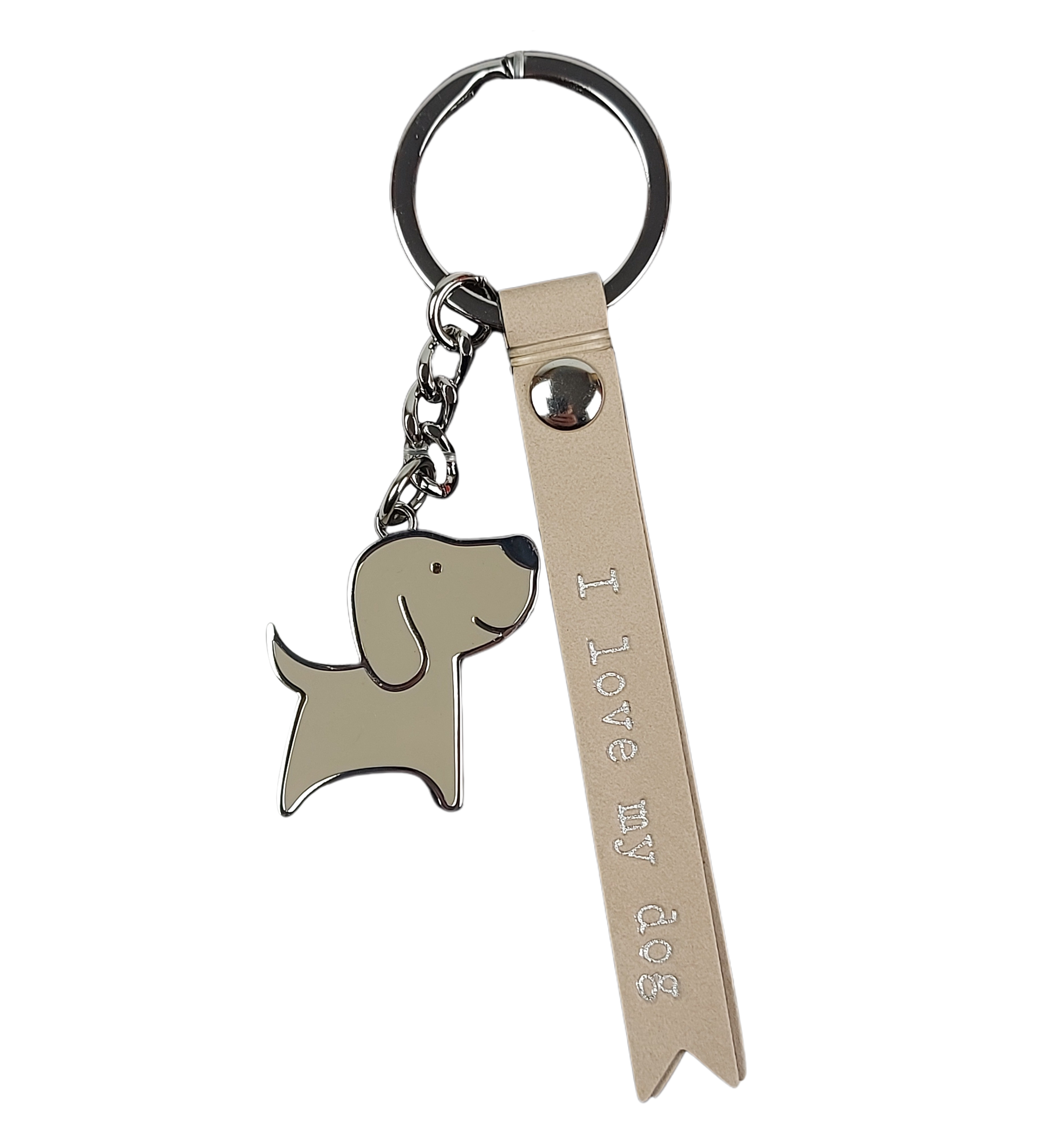Der Schlüsselanhänger besteht aus zwei detailverliebten Elementen. Das niedliche Hündchen aus silberfarbenem Metall ist mit cappuccinofarbener Emaille verziert und hat süße Schlappohren – ein liebevolles Detail, das sofort ins Auge fällt. Ergänzt wird es durch ein beiges Fähnchen aus hochwertigem Kunstleder. Darauf steht in glänzender, silberner Schrift: „I love my Dog“. Eine kleine Botschaft, die viel sagt – leise, aber mit Gefühl.