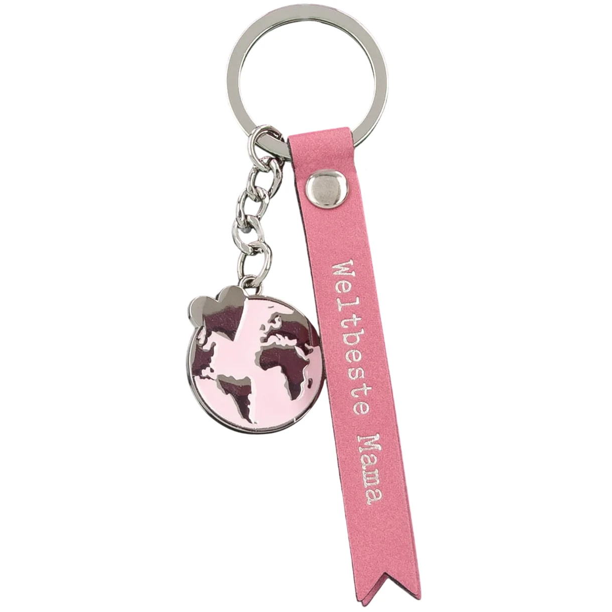 Dieser entzückende Schlüsselanhänger setzt sich aus zwei besonderen Elementen zusammen. Zum einen schmückt ein detailreich gestalteter Weltkugel-Anhänger aus emailliertem Metall das Accessoire. Die zarte hellrosa Emaile kombiniert mit einem kleinen silbernen Herzchen bringt Wärme und Liebe ins Design. Zum anderen ergänzt ein hochwertiges Fähnchen aus dunkelrosafarbenem Kunstleder das Arrangement perfekt. In eleganter Silberprägung steht dort die liebevolle Botschaft: „Weltbeste Mama“ – ehrlich, herzlich und wunderschön.