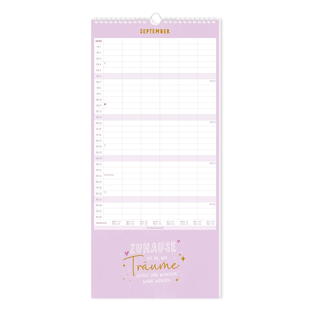 Bereits das lila Cover mit der eleganten Kupferveredelung und dem warmen Spruch „Zuhause ist da, wo Träume geteilt und Wünsche wahr werden“ macht deutlich, worum es geht: um Zusammenhalt, um Liebe, um das kleine große Glück im Alltag. Monat für Monat überrascht der Planer mit individuellen Seiten – jede in einer anderen Farbe, mit einem eigenen motivierenden Spruch und einem harmonisch gestalteten Motiv.