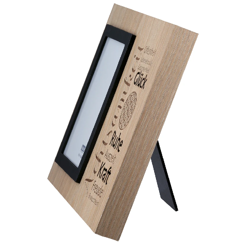 Links bietet ein schwarzfarbener Rahmen mit schützendem Glas Platz für ein Foto im Format 10 x 15 cm – vielleicht ein ganz besonderer Moment, ein Lieblingsmensch oder ein Herzensort. Rechts davon zieht die filigrane Gravur der „Blume des Lebens“ zusammen mit inspirierenden Begriffen wie Achtsamkeit, Lebensfreude, Gelassenheit oder Bewusstsein die Blicke auf sich. Die Worte Glück, Ruhe und Kraft sind dabei durchbrochen und lassen das sanfte Licht der integrierten LEDs durchscheinen – ein bezaubernder Effekt, der emotionale Wärme und Geborgenheit ausstrahlt.