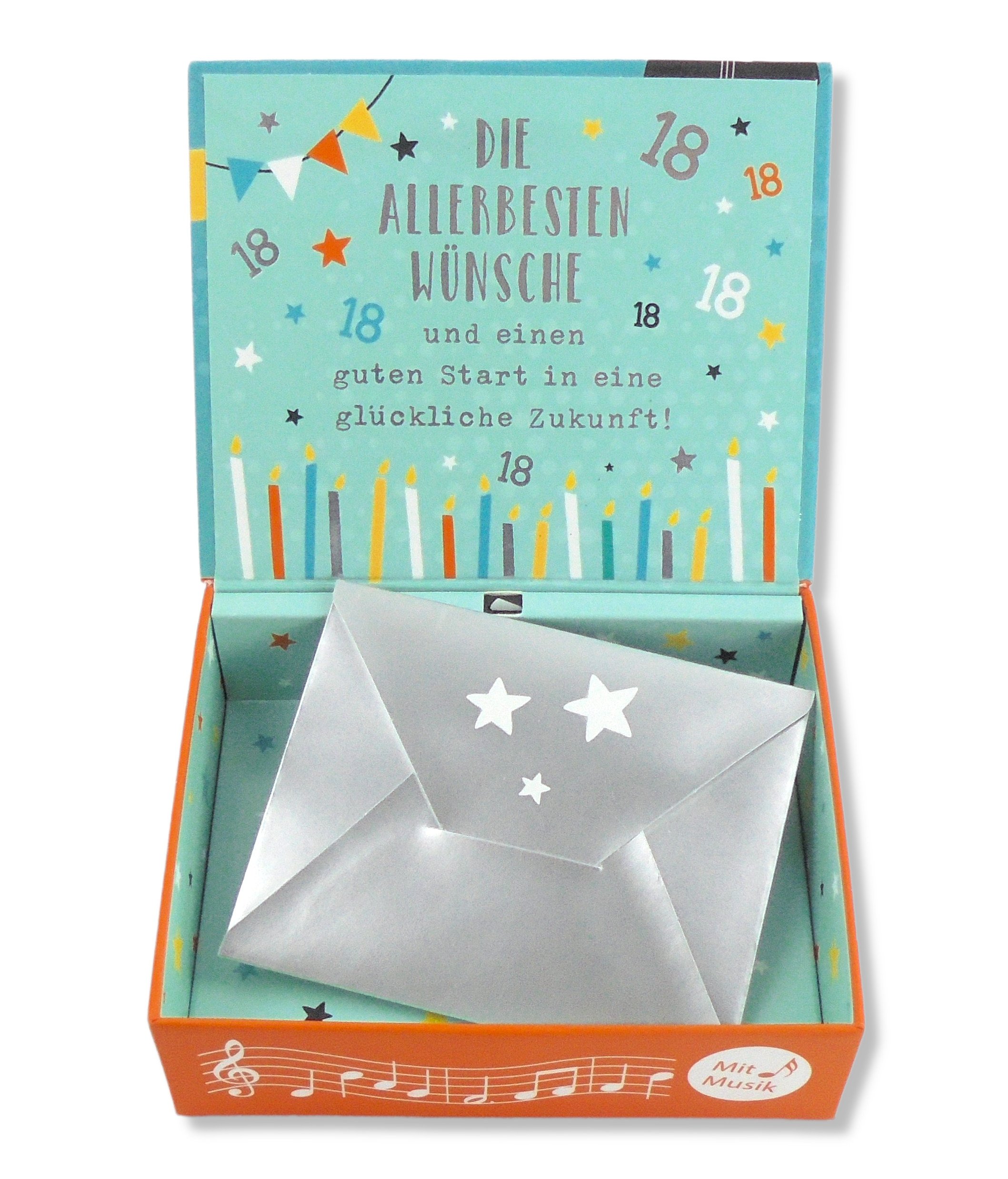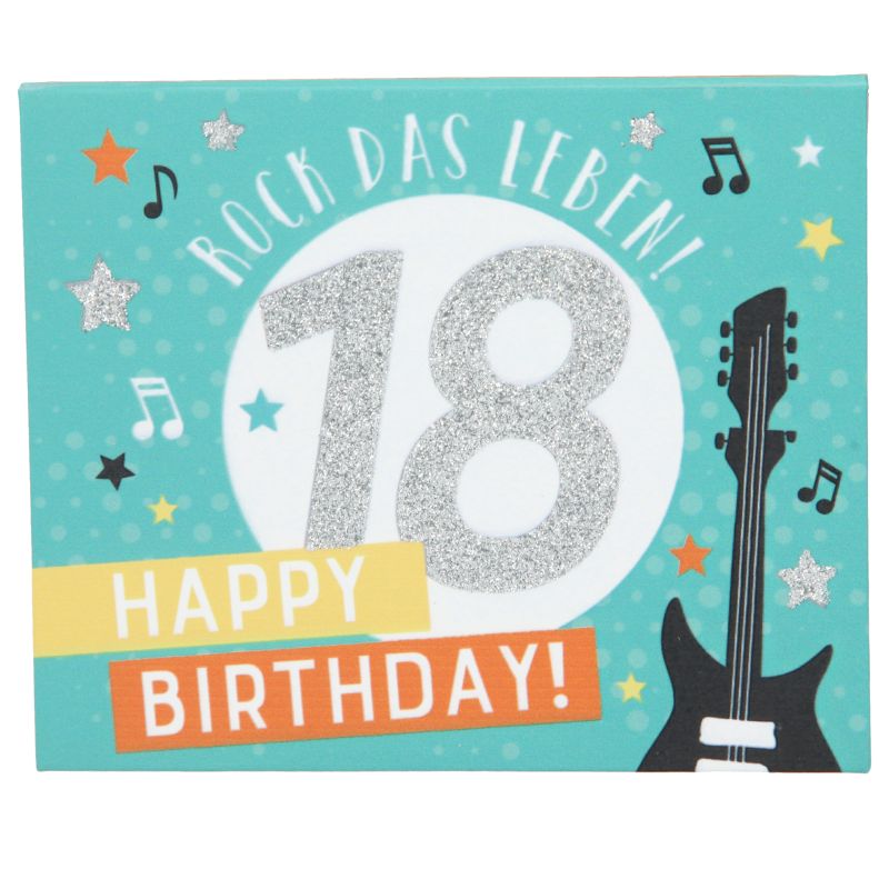 Von außen begeistert die stabile Pappbox mit einer edlen silberglitzernden „18“, den fröhlichen Worten „ROCK DAS LEBEN“ und „HAPPY BIRTHDAY“, liebevoll ergänzt durch Sterne, Notensymbole und eine Gitarre – ein echter Hingucker! Im Inneren erwartet den oder die Beschenkte ein herzlicher Gruß: „Die allerbesten Wünsche und einen guten Start in eine glückliche Zukunft“ – was für eine schöne Botschaft zum Erwachsenwerden!