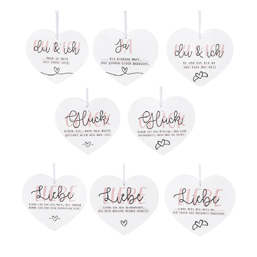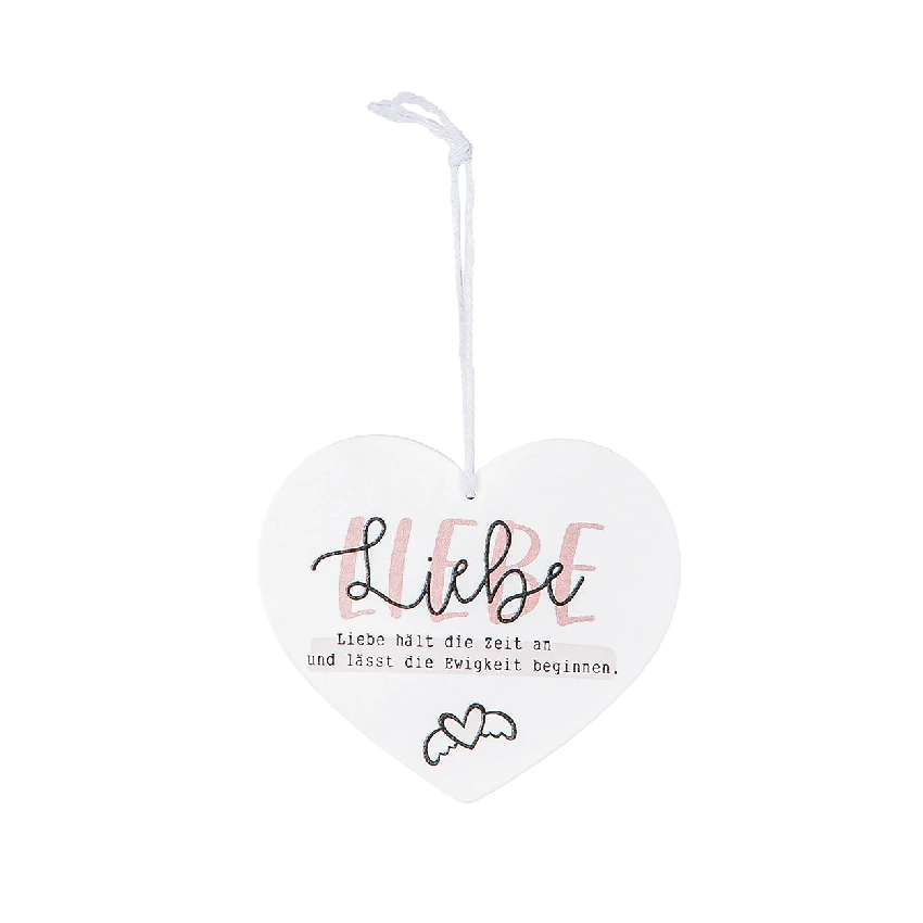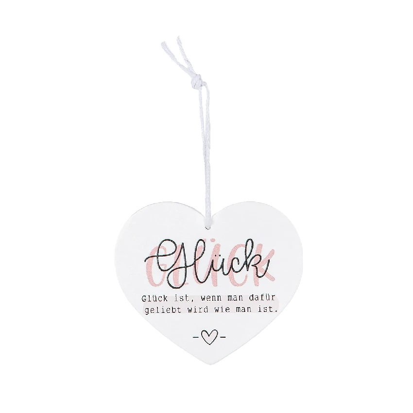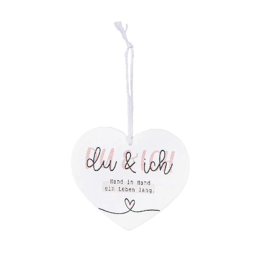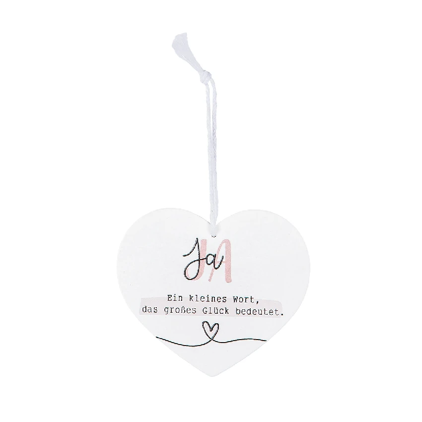 Gefertigt aus weiß lackiertem MDF, überzeugt der Anhänger durch seine hochwertige Verarbeitung und seine stilvolle Gestaltung. In eleganter Herzform und mit liebevoll aufgedruckten Sprüchen zu den Schriftzügen „Liebe“, „Glück“, „Ja“ oder „du & ich“, sorgt er für Emotionen, die bleiben. Der zweifarbige Druck in Schwarz und zartem Rosa unterstreicht die romantische Botschaft – dezent, aber mit viel Ausdruckskraft. Ein kleines Herz als grafisches Detail rundet das Design harmonisch ab.
