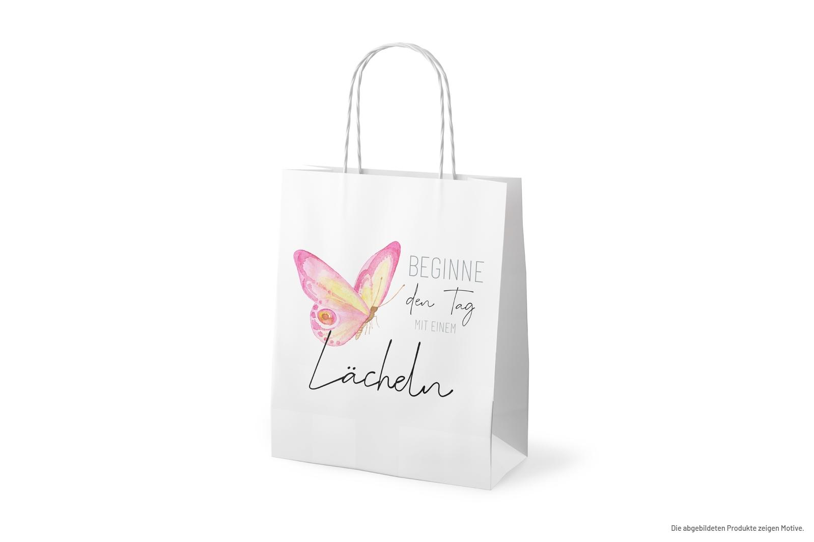 Ein schöner Schriftzug auf weißem Grund “Beginne den Tag mit einem Lächeln” und ein schöner pinker Schmetterling vervollständigen diese wunderschöne Geschenktüte.