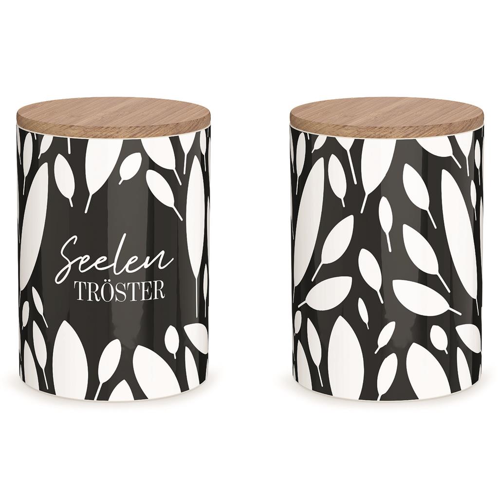 Die Dose selbst besteht aus stabiler Keramik. Dadurch eignet sie sich hervorragend zur Aufbewahrung von Lebensmitteln. Sie nimmt weder Gerüche noch austretende Stoffe auf und ist leicht zu reinigen. Der Holzdeckel mit Silikondichtung sorgt dafür, dass keine Fremdstoffe oder Feuchtigkeit in die Dose gelangen können. Gleichzeitig sorgt er für ein gleichbleibendes Klima im Inneren des Vorratsbehälters. Dies macht die Dose zur perfekten Aufbewahrungsmöglichkeit für trockene Lebensmittel wie Nudeln, Mehl oder Zucker. Aber auch Gewürze und Kräuter bleiben in ihr länger frisch und aromatisch. Selbstverständlich ist sie auch ein hervorragendes, dekoratives Versteck für Naschereien, Kekse und Knabberkram!