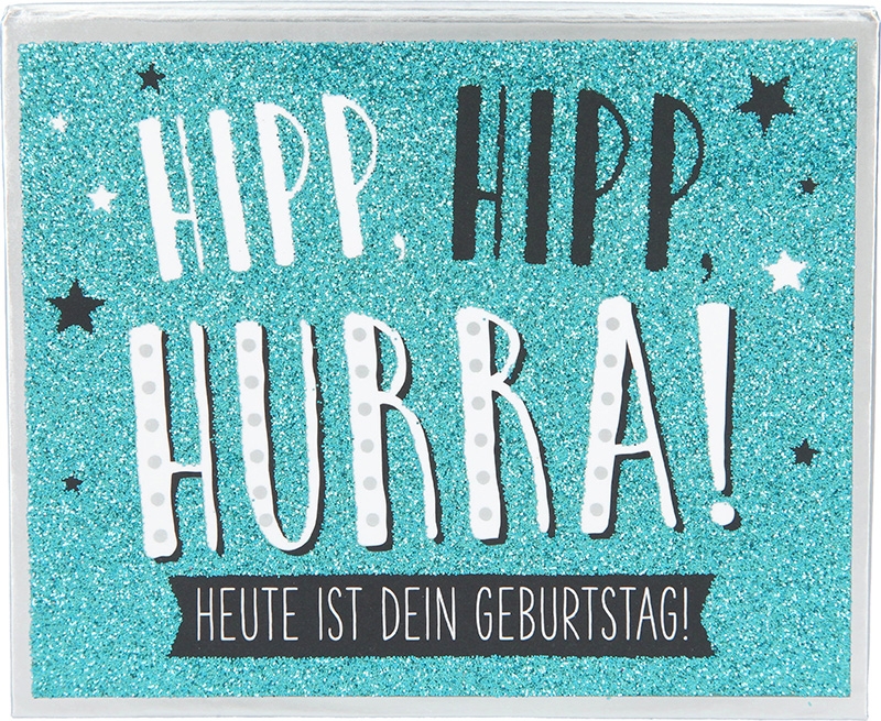 Äußerlich ziert die türkis glitzernde Soundbox der Spruch „Hipp Hipp Hurra! Heute ist dein Geburtstag” sowie kleine Sterne. Passend dazu steht auf der Innenseite des Deckels der Rest des Glückwunsches „Lass dich feiern“.