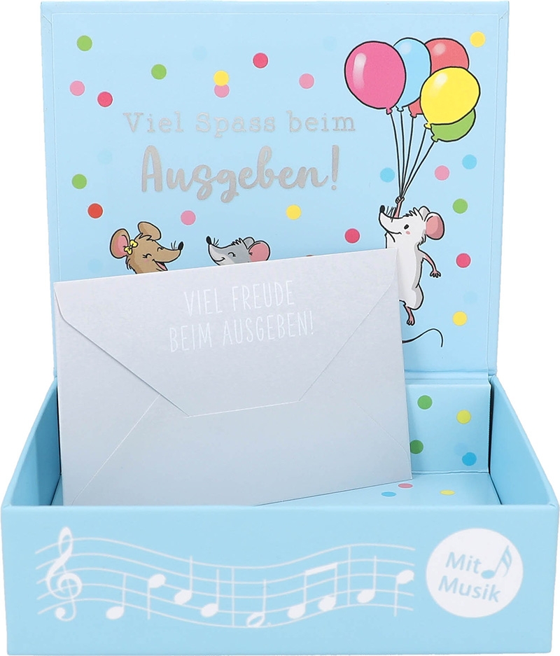 Äußerlich ziert die Soundbox Mäuse mit bunten Luftballons „Ein paar Mäuse zum Verjubeln”. Passend dazu steht auf der Innenseite des Deckels “Viel Spaß beim Ausgeben.”.