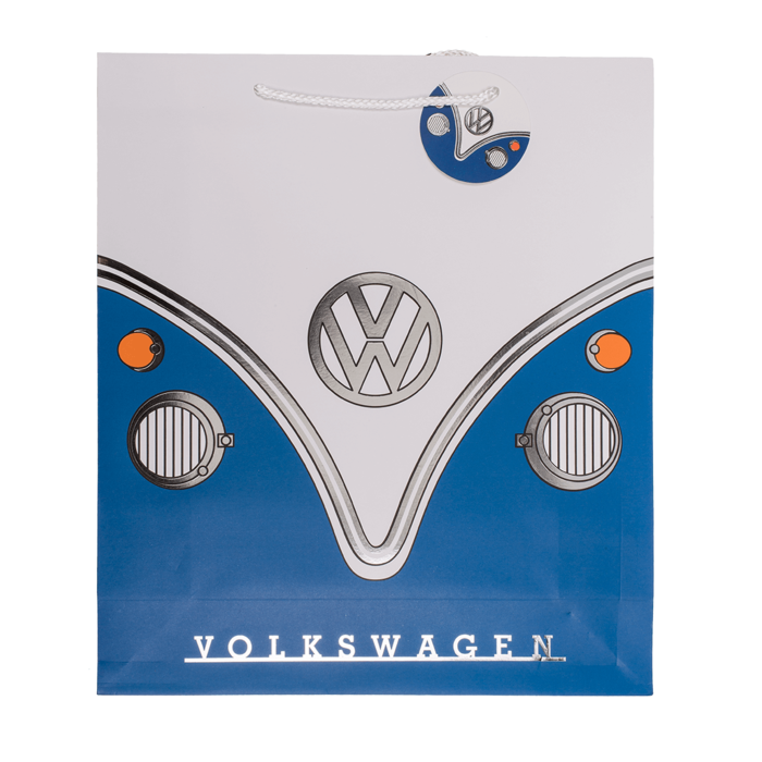 Die Geschenktüte VW T1 Bus “Blau” XL ist DIE Geschenkverpackung für VW-Fans, Bulli-Enthusiasten und Nostalgiker. Die beiden großen Seiten der Tüte sind so gestaltet, dass sie aussehen wie das knuffige “Gesicht” des legendären T1-“Bulli” von Volkswagen. Bei der Tüte “Blau” XL ist die Front des Busses im klassischen Volkswagen-Blau gehalten. Mit den Abmessungen 40 x 35 cm ist sie durchaus auch für etwas größere Geschenke geeignet.