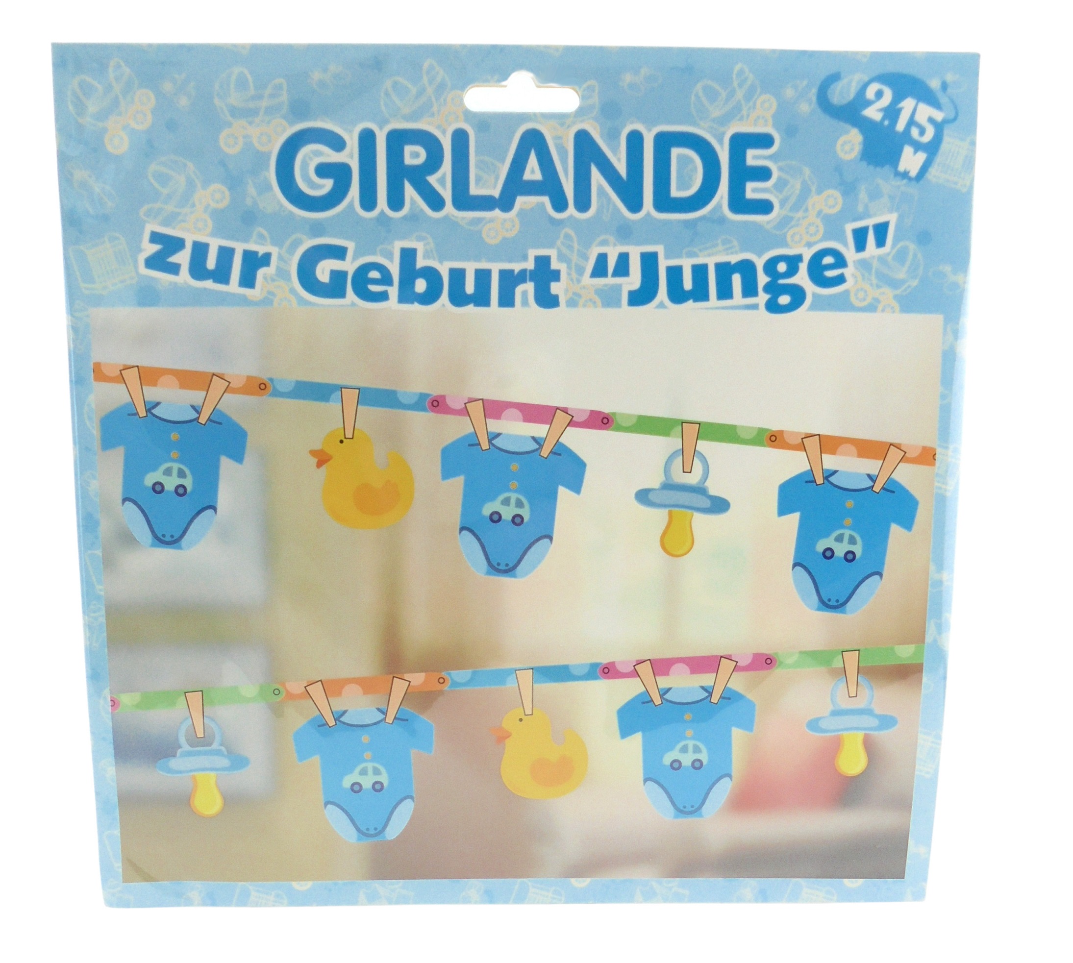 Die Motive, bestehend aus kleinen Stramplern, Schnullern und niedlichen Entchen sind aufhängt wie an einer Wäscheleine. Auf den Stramplern ist außerdem noch ein niedliches, kleines Auto abgebildet.